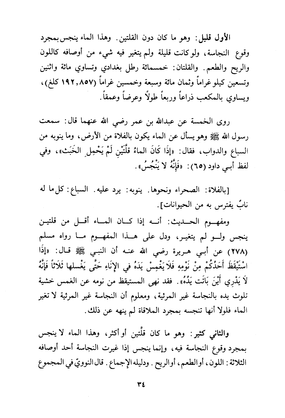 الأول قليل: وهو ما كان دون القلتين. وهذا الماء ينجس بمجرد وقوع النجاسة، ولو كانت قليلة ولم يتغير فيه شيء من أوصافه كاللون والريح والطعم. والقلتان: خمسمائة رطل بغدادي وتساوي مائة وأثنين وتسعين كيلو غراماً وثمان مائة وسبعة وخمسين غراماً (857، 192 كلغ)، ويساوي بالمكعب ذراعاً وربعاً طولاً وعرضاً وعمقاً.