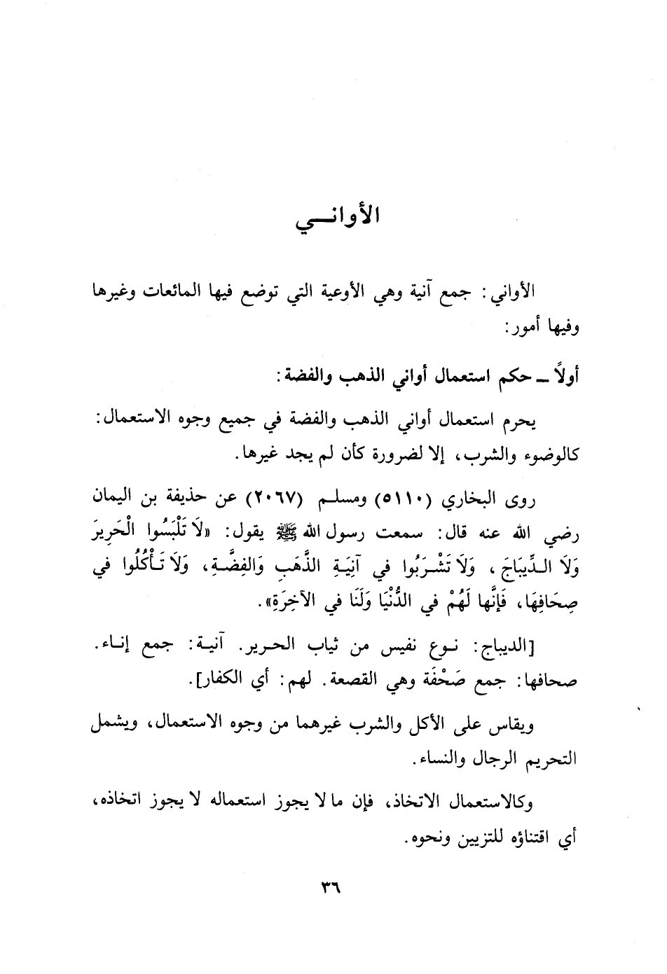 الأواني: جمع آنية وهي الأوعية التي توضع فيها المائعات وغيرها وفيها أمور: