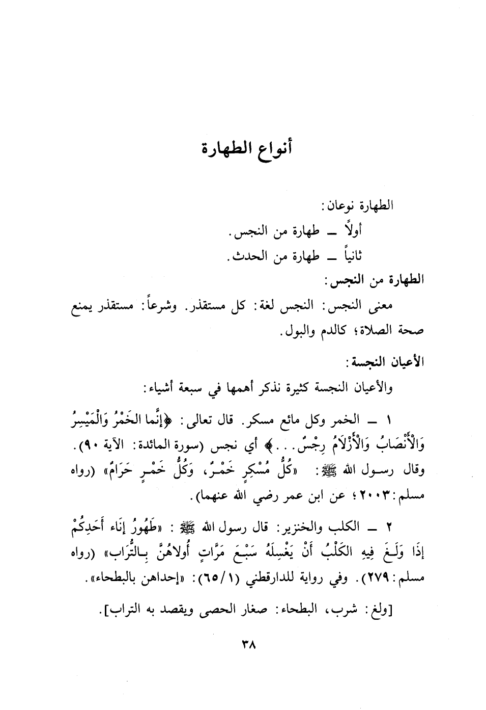 2ـ الكلب والخنزير: قال رسول الله - صلى الله عليه وسلم -: " طهور إناء أحدكم إذا ولغ فيه الكلب أن يغسله سبع مرات أولاهن بالتراب" [رواه مسلم: 279]. وفي رواية للدارقطني (1/ 65): "إحداهن بالبطحاء".