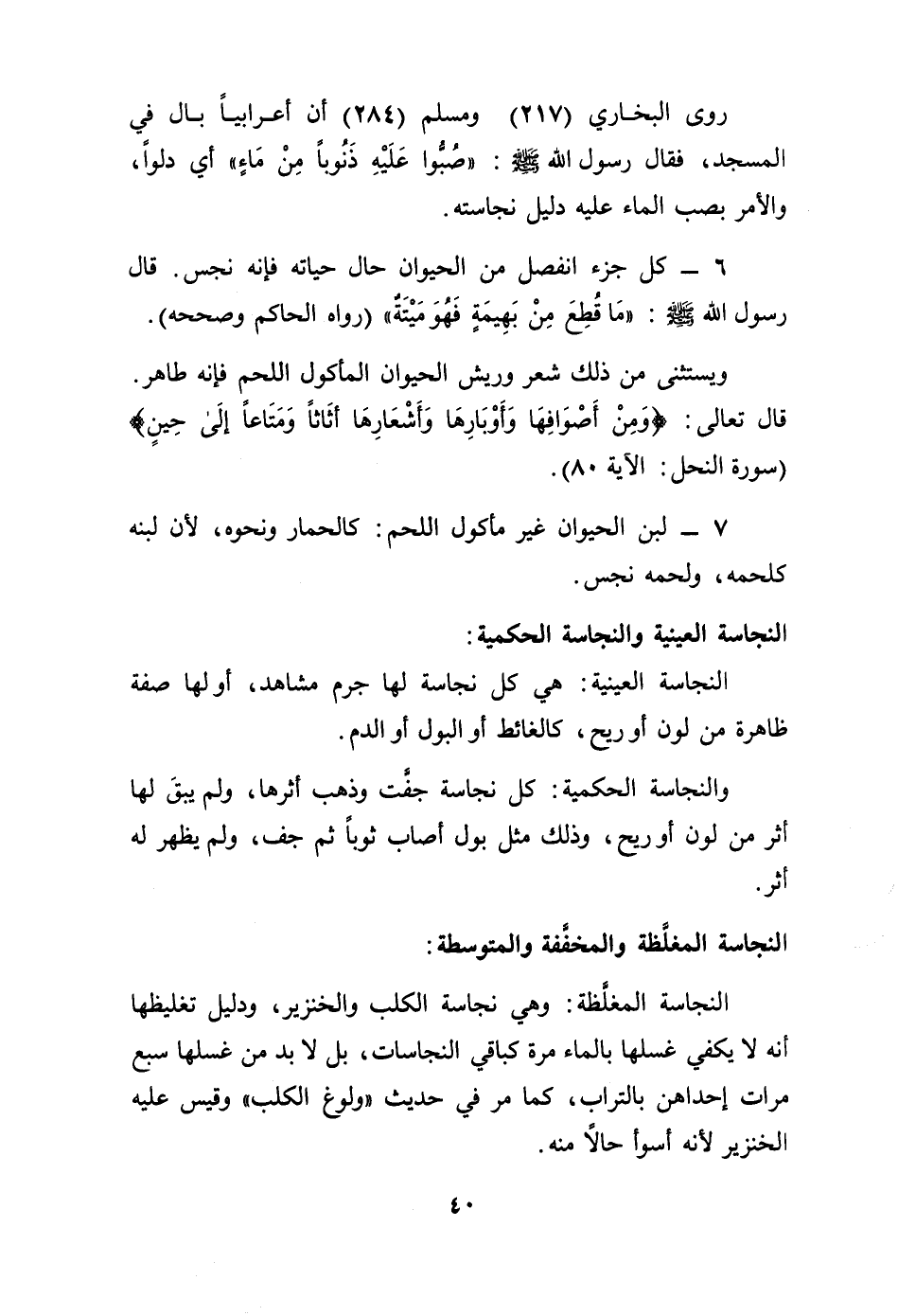 6ـ كل جزء انفصل من الحيوان حال حياته فإنه نجس. قال رسول الله - صلى الله عليه وسلم -: "ما قطع من بهيمة فهو ميتة" [رواه الحاكم وصححه].