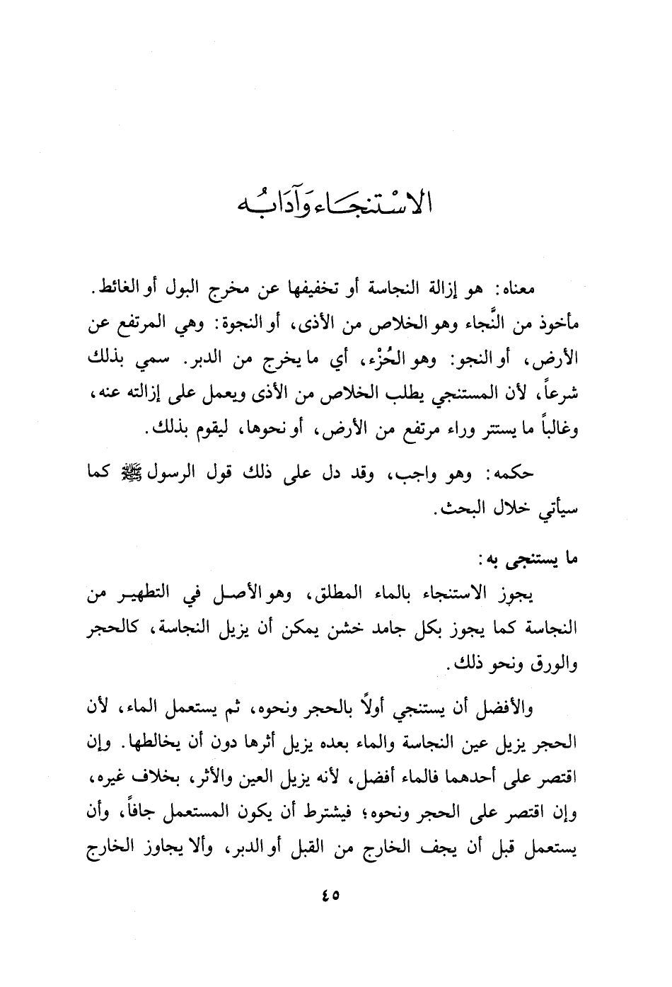 معناه: هو إزالة النجاسة أو تخفيفها عن مخرج البول أو الغائط. مأخوذ من النَّجاء وهو الخلاص من الأذى، أو النجوة: وهي المرتفع عن الأرض، أو النجو: وهو الحُزْء، أي ما يخرج من الدبر. سمي بذلك شرعاً، لأن المستنجي يطلب الخلاص من الأذى ويعمل على إزالته عنه، وغالباً ما يستتر وراء مرتفع من الأرض، أو نحوها، ليقوم بذلك.
