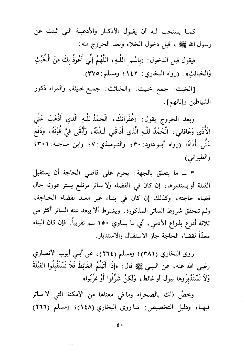 كما يستحب له أنن يقول الأذكار والأدعية التي ثبتت عن رسول الله - صلى الله عليه وسلم -، قبل دخول الخلاء وبعد الخروج منه: