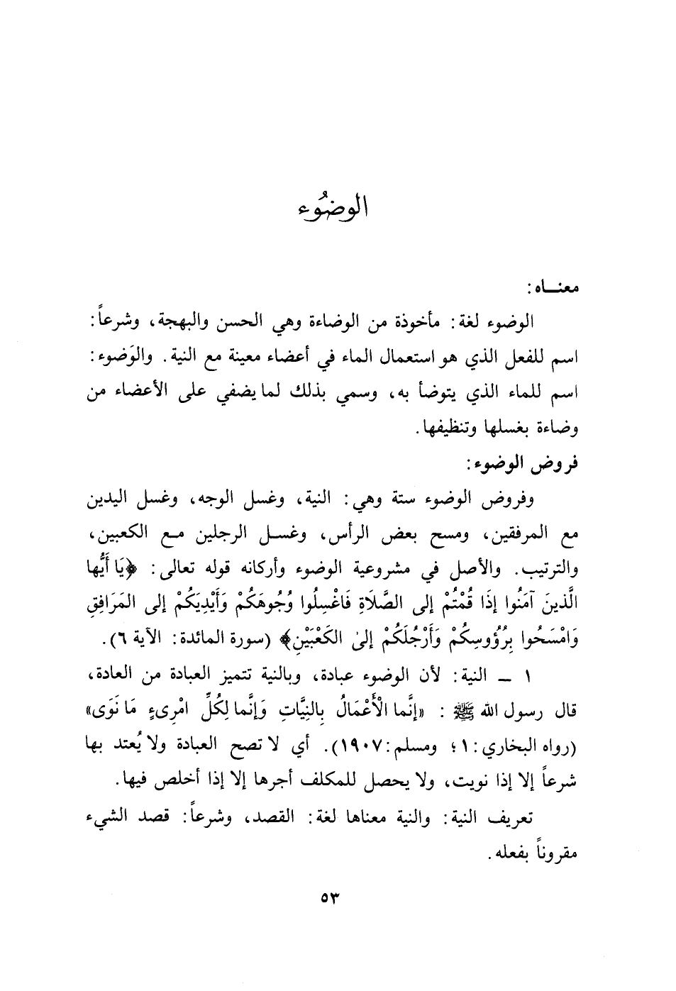 1ـ النية: لأن الوضوء عبادة، وبالنية تتميز العبادة، قال رسول الله - صلى الله عليه وسلم -: "إنما الأعمال بالنيات وإنما لكل امرئ ما نوى" [رواه البخاري: 1، ومسلم: 1907]. أي لا تصح العبادة ولا يعتد بها شرعاً إلا إذا نويت، ولا يحصل للمكلف أجرها إلا إذا أخلص فيها.