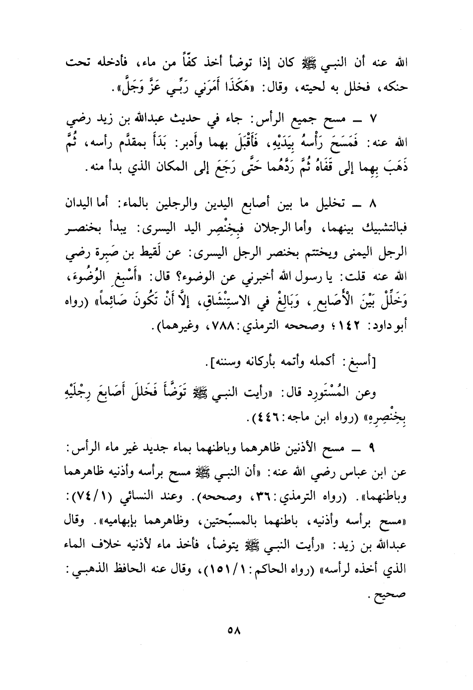 8ـ تخليل ما بين أصابع اليدين والرجلين بالماء: أما اليدين فبالتشبيك بينهما، وأما الرجلان فبخنصر اليد اليسرى: عن لقيط بن صبرة - رضي الله عنه - قلت: يا رسول الله أخبرني عن الوضوء؟ قال: "أسبغ الوضوء، وخلل بين الأصابع، وبالغ في الاستنشاق، إلا أن تكون صائماً" [رواه أبو داود: 142، وصححه الترمذي: 788، وغيرهما]