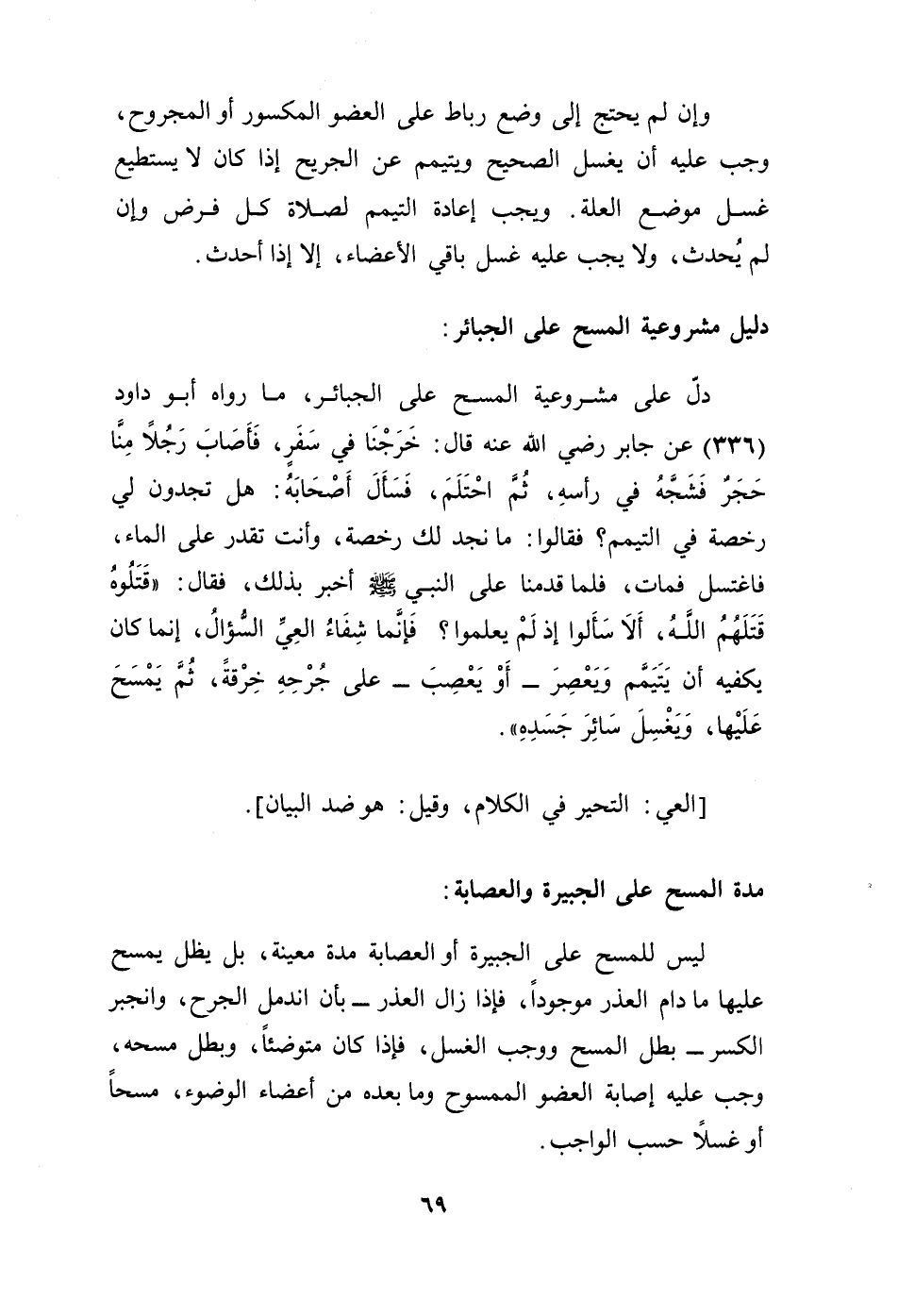 دلّ على مشروعية المسح على الجبائر، ما رواه أبو داود (336) عن جابر - رضي الله عنه - قال: خرجنا في سفر، فأصاب رجلاً منا حجر فشجه في رأسه، ثم احتلم، فسأل أصحابه: هل تجدون في رخصة في التيمم؟ فقالوا: ما نجد لك رخصة، وأنت تقدر على الماء، فاغتسل عمات، فلما قدمنا على النبي - صلى الله عليه وسلم - أخبر بذلك، فقال: "قتلوه قتلهم الله، ألا سألوا إذ لم يعلموا؟ فإنما شفاء العي السؤال، إنما كان يكفيه أن يتيمم ويعصر ـ أو يعصب ـ على جرحه خرقة، قم يمسح عليها، ويغسل سائر جسده".