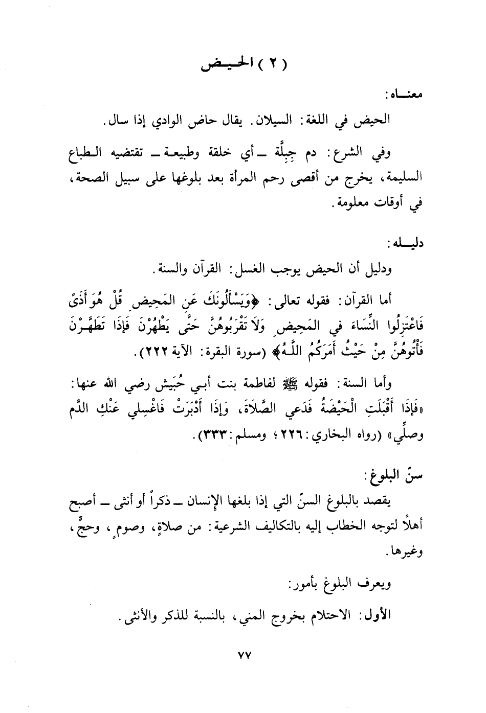 وأما السنة: فقوله - صلى الله عليه وسلم - لفاطمة بنت أبي حبيش رضي الله عنهما: " فإذا أقبلت الحيضة فدعي الصلاة، وإذا أدبرت فاغسلي عنك الدم وصلي " [رواه البخاري: 226، ومسلم 333].