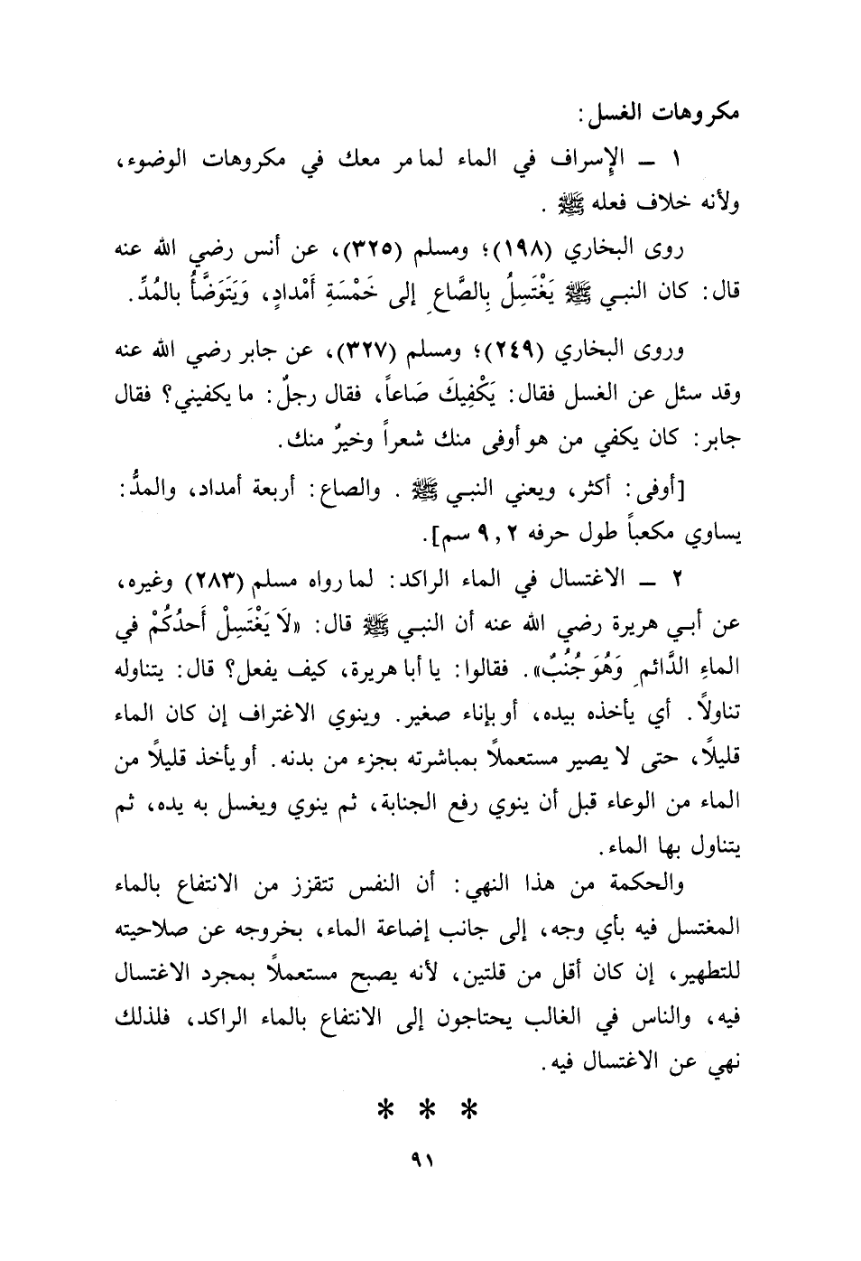 2ـ الاغتسال في الماء الراكد: لما رواه مسلم (283)، وغيره، عن أبي هريرة - رضي الله عنه - أن النبي - صلى الله عليه وسلم - قال: "لا يغتسل أحدكم في الماء الدائم وهو جنب". فقالوا: يا أبا هريرة. كيف يفعل؟ قال: يتناوله تناولاً. أي يأخذه بيده، أو بإناء صغير. وينوي الاغتراف إن كان الماء قليلاً، حتى لا يصير مستعملاً بمباشرته بجزء من بدنه. أو يأخذ قليلاً من الماء من الوعاء قبل أن ينوي رفع الجنابة، ثم ينوي ويغسل به يده، ثم يتناول بها الماء.