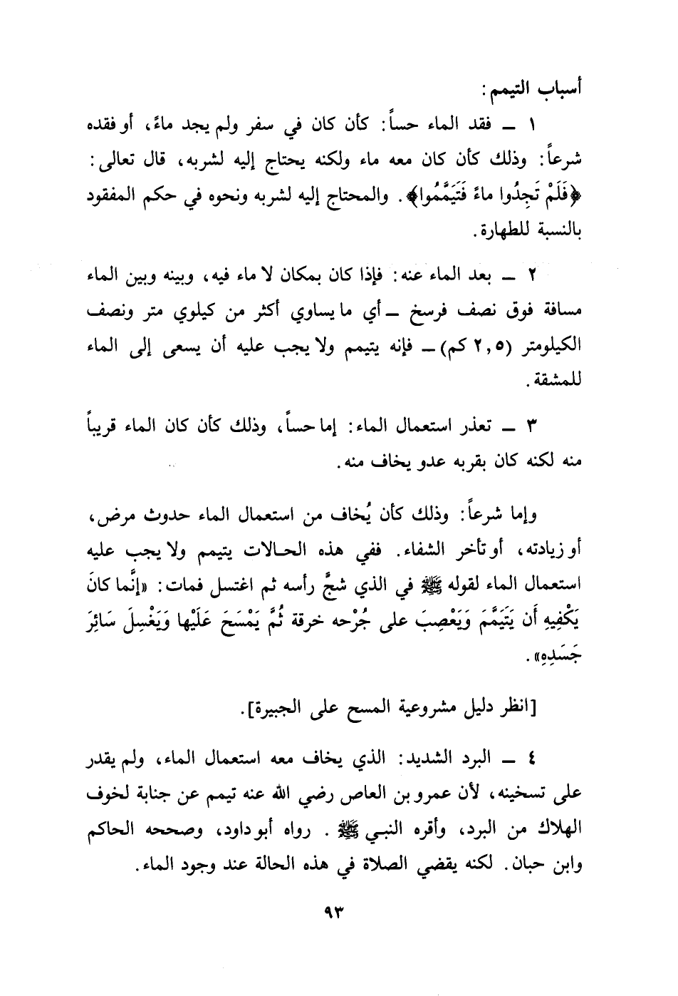 1ـ فقد الماء حساً: كأن كان في سفر ولم يجد ماء، أو فقده شرعاً: وذلك كأن كان معه ماء ولكنه يحتاج إليه لشربه، قال تعالى: (فلم تجدوا ماء فتيمموا). والمحتاج إليه لشربه ونحوه في حكم المفقود بالنسبة للطهارة.