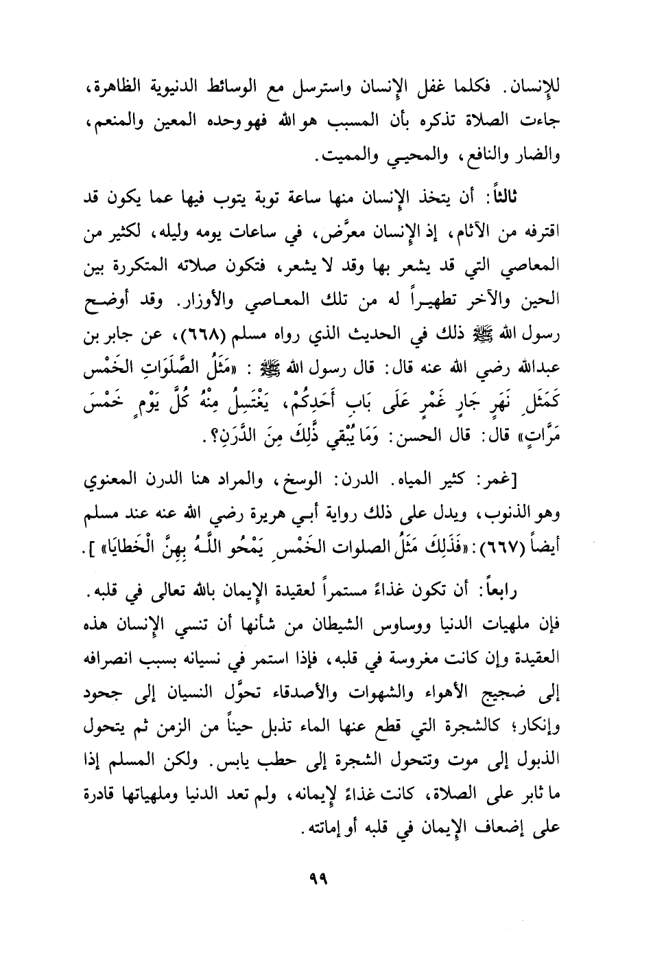 ثالثاً: أن يتخذ الإنسان منها ساعة توبة يتوب فيها عما يكون قد اقترفه من الآثام، إذ الإنسان معرَّض، في ساعات يومه وليله، لكثير من المعاصي التي قد يشعر بها وقد لا يشعر، فتكون صلاته المتكررة بين الحين والآخر تطهيراً له من تلك المعاصي والأوزار. وقد أوضح رسول الله - صلى الله عليه وسلم - ذلك في الحديث الذي رواه مسلم (668)، عن جابر بن عبدالله رضي الله عنه قال: قال رسول الله - صلى الله عليه وسلم -: "مثل الصلوات الخمس كمثل نهر جار غَمْر على باب أحدكم، يغتسل منه كل يوم خمس مرات" قال: قال الحسن: وما يبقى ذلك من الدرن؟.