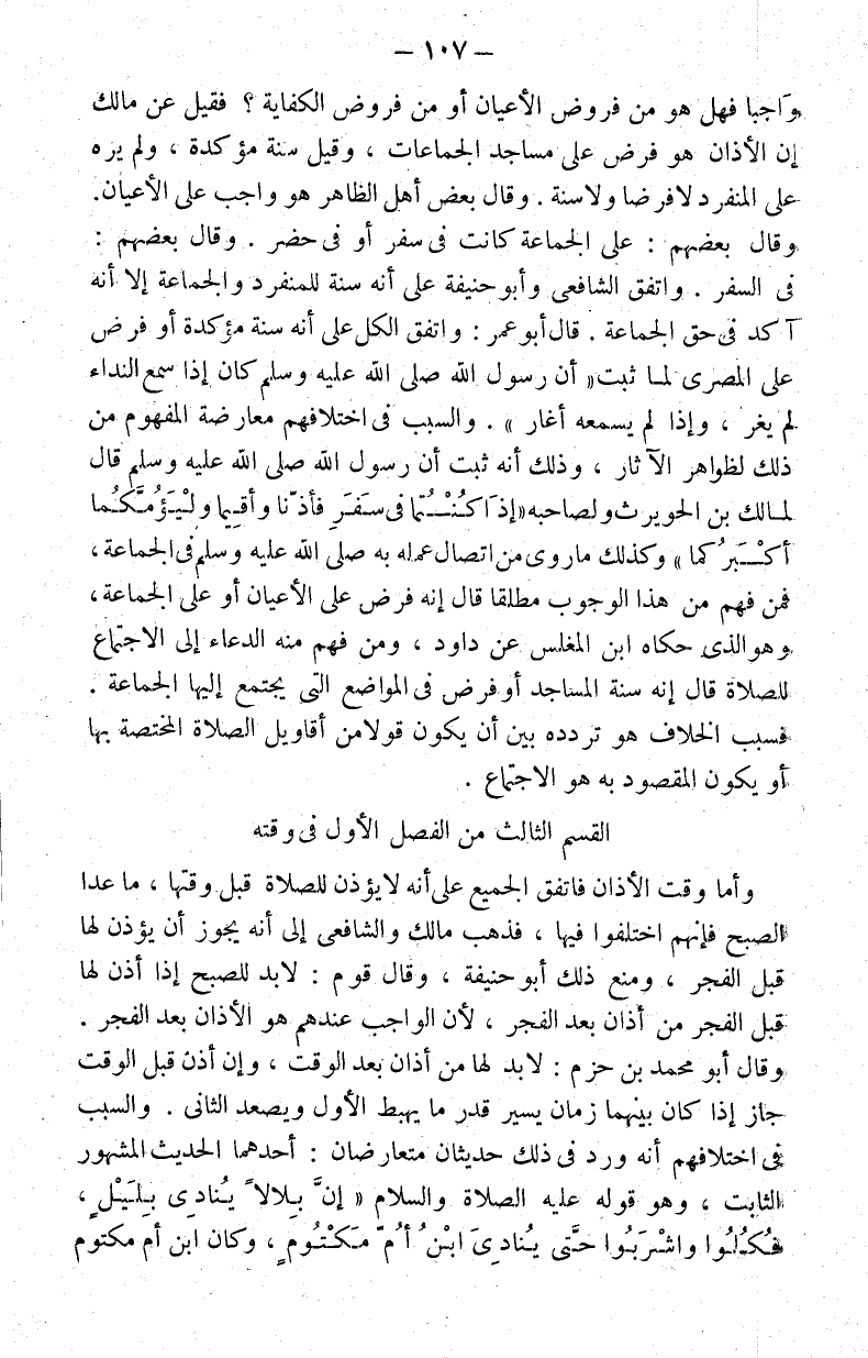 واجبا فهل هو من فروض الأعيان أو من فروض الكفاية؟ فقيل عن مالك إن الأذان هو فرض على مساجد الجماعات وقيل سنة مؤكدة ولم يره على المنفرد لا فرضا ولا سنة. وقال بعض أهل الظاهر واجب على الأعيان. وقال بعضهم: على الجماعة كانت في أو في حضر. وقال بعضهم: في السفر. واتفق الشافعي وأبو حنيفة على أنه سنة للمنفرد والجماعة إلا أنه آكد في حق الجماعة. قال أبو عمر: واتفق الكل على أنه سنة مؤكدة أو فرض على المصري لما ثبت أن رسول الله صلى الله عليه وسلم كان إذا سمع النداء لم يغر وإذا لم يسمعه أغار. والسبب في اختلافهم معارضة المفهوم من ذلك لظواهر الآثار, وذلك أنه ثبت أن رسول الله صلى الله عليه وسلم قال لمالك بن الحويرث ولصاحبه: "إذا كنتما في سفر فأذنا وأقيما وليؤمكما أكبركما" وكذلك ما روى من اتصال عمله به صلى الله عليه وسلم في الجماعة فمن فهم من هذا الوجوب مطلقا قال إنه فرض على الأعيان أو على الجماعة وهو الذي حكاه ابن المفلس عن داود ومن فهم منه الدعاء إلى الاجتماع للصلاة قال إنه سنة في المساجد أو فرض في المواضع التي يجتمع إليها الجماعة. فسبب الخلاف هو تردده بين أن يكون قولا من أقاويل الصلاة المختصة بها أو يكون المقصود به هو الاجتماع.