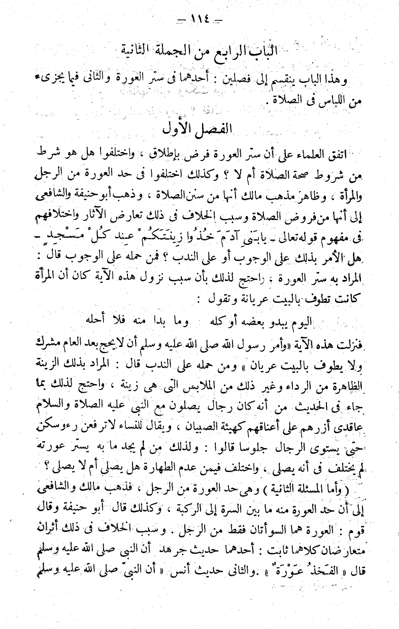 وهذا الباب ينقسم إلى فصلين: أحدهما في ستر العورة والثاني فيما يجزئ من اللباس في الصلاة.
