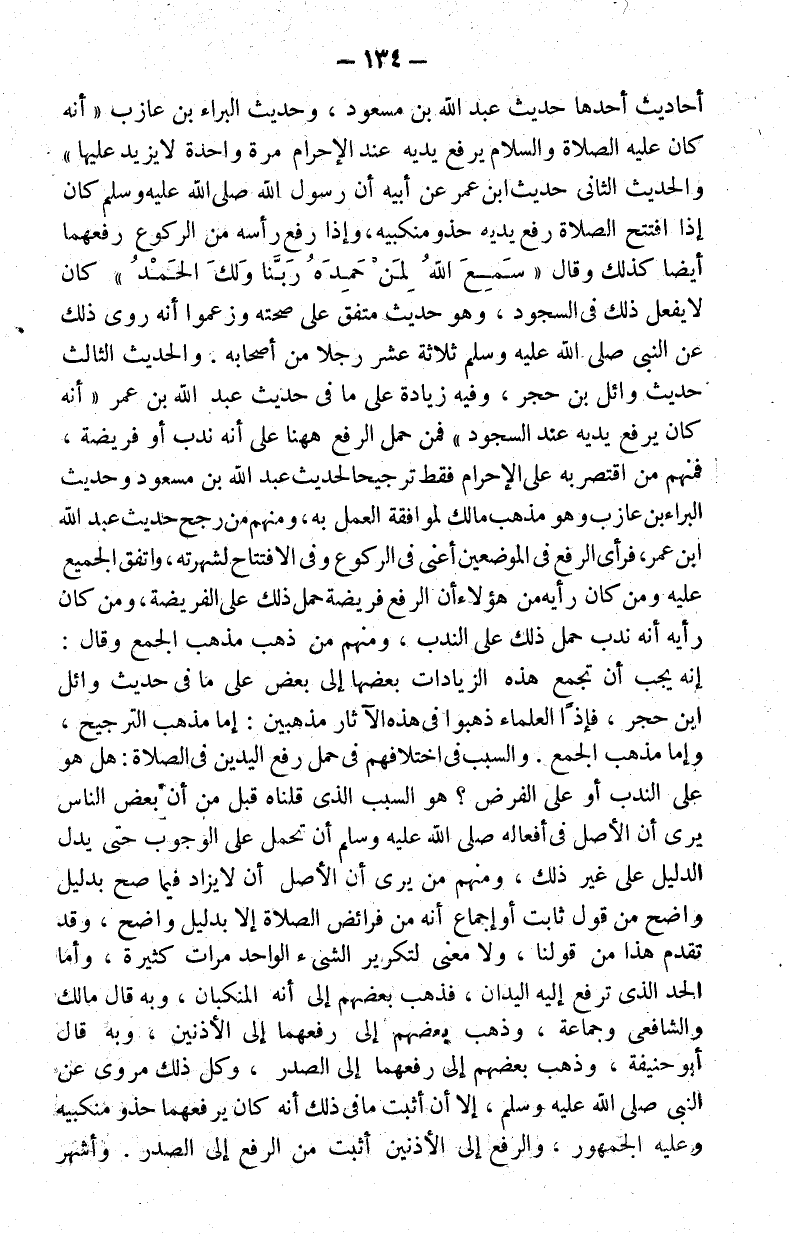 أحاديث أحدها حديث عبد الله بن مسعود وحديث البراء بن عازب أنه كان عليه الصلاة والسلام يرفع يديه عند الإحرام مرة واحدة لا يزيد عليها والحديث الثاني حديث سالم بن عبد الله ابن عمر عن أبيه أن رسول الله صلى الله عليه وسلم كان إذا افتتح الصلاة رفع يديه حذو منكبيه وإذا رفع رأسه من الركوع رفعهما أيضا كذلك وقال: "سمع الله لمن حمده ربنا ولك الحمد" وكان لا يفعل ذلك في السجود وهو حديث متفق على صحته وزعموا أنه روى ذلك عن النبي صلى الله عليه وسلم ثلاثة عشر رجلا من أصحابه. حديث وائل بن حجر وفيه زيادة على ما في حديث عبد الله بن عمر أنه كان يرفع يديه عند السجود فمن حمل الرفع هاهنا على أنه ندب أو فريضة فمنهم من اقتصر به على الإحرام فقط ترجيحا لحديث عبد الله بن مسعود وحديث البراء بن عازب وهو مذهب مالك لموافقة العمل به ومنهم من رجح حديث عبد الله بن عمر فرأى الرفع في الموضعين أعني في الركوع وفي الافتتاح لشهرته واتفق الجميع عليه ومن كان رأيه من هؤلاء أن الرفع فريضة حمل ذلك على الفريضة ومن كان رأيه أنه ندب حمل ذلك على الندب ومنهم من ذهب مذهب الجمع وقال: إنه يجب أن تجمع هذه الزيادات بعضها إلى بعض على ما في حديث وائل بن حجر فإذن العلماء ذهبوا في هذه الآثار مذهبين: إما مذهب الترجيح وإما مذهب الجمع. والسبب في اختلافهم في حمل رفع اليدين في الصلاة: هل هو على الندب أو على الفرض؟ هو السبب الذي قلناه قبل من أن بعض الناس يرى أن الأصل في أفعاله صلى الله عليه وسلم أن تحمل على الوجوب حتى يدل الدليل على غير ذلك ومنهم من يرى أن الأصل أن لا يزاد فيما صح بدليل واضح من قول ثابت أو إجماع أنه من فرائض الصلاة إلا بدليل واضح وقد تقدم هذا من قولنا ولا معنى لتكرير الشيء الواحد مرات كثيرة وأما الحد الذي ترفع إليه اليدان فذهب بعضهم إلى أنه المنكبان وبه قال مالك والشافعي وجماعة وذهب بعضهم إلى رفعها إلى الأذنين وبه قال أبو حنيفة وذهب بعضهم إلى رفعها إلى الصدر وكل ذلك مروي عن النبي صلى الله عليه وسلم إلا أن أثبت ما في ذلك أنه كان يرفعهما حذو منكبيه وعليه الجمهور والرفع إلى الأذنين أثبت من الرفع إلى الصدر. وأشهر.