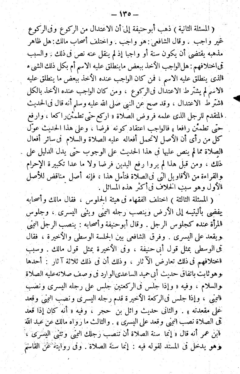 المسألة الثانية : ذهب أبو حنيفة إلى أن الاعتدال من الركوع وفي الركوع غير واجب. وقال الشافعي: هو واجب. واختلف أصحاب مالك: هل ظاهر مذهبه يقتضي أن يكون سنة أو واجبا إذ لم ينقل عنه نص في ذلك؟ والسبب في اختلافهم: هل الواجب الأخذ ببعض ما ينطلق عليه الاسم أم بكل ذلك الشيء الذي ينطلق عليه الاسم, فمن كان الواجب عنده الأخذ ببعض ما ينطلق عليه الاسم لم يشترط الاعتدال في الركوع, ومن كان الواجب عنده الأخذ بالكل اشترط الاعتدال وقد صح عن النبي صلى الله عليه وسلم أنه قال في الحديث المتقدم للرجل الذي علمه فروض الصلاة: "اركع حتى تطمئن راكعا وارفع حتى تطمئن رافعا" فالواجب اعتقاد كونه فرضا وعلى هذا الحديث عول كل من رأى أن الأصل لا تحمل أفعاله عليه الصلاة والسلام في سائر أفعال الصلاة مما لم ينص عليها في هذا الحديث على الوجوب حتى يدل الدليل على ذلك ومن قبل هذا لم يروا رفع اليدين فرضا ولا ما عدا تكبيرة الإحرام والقراءة من الأقاويل التي في الصلاة فتأمل هذا فإنه أصل مناقض للأصل الأول وهو سبب الخلاف في أكثر هذه المسائل.