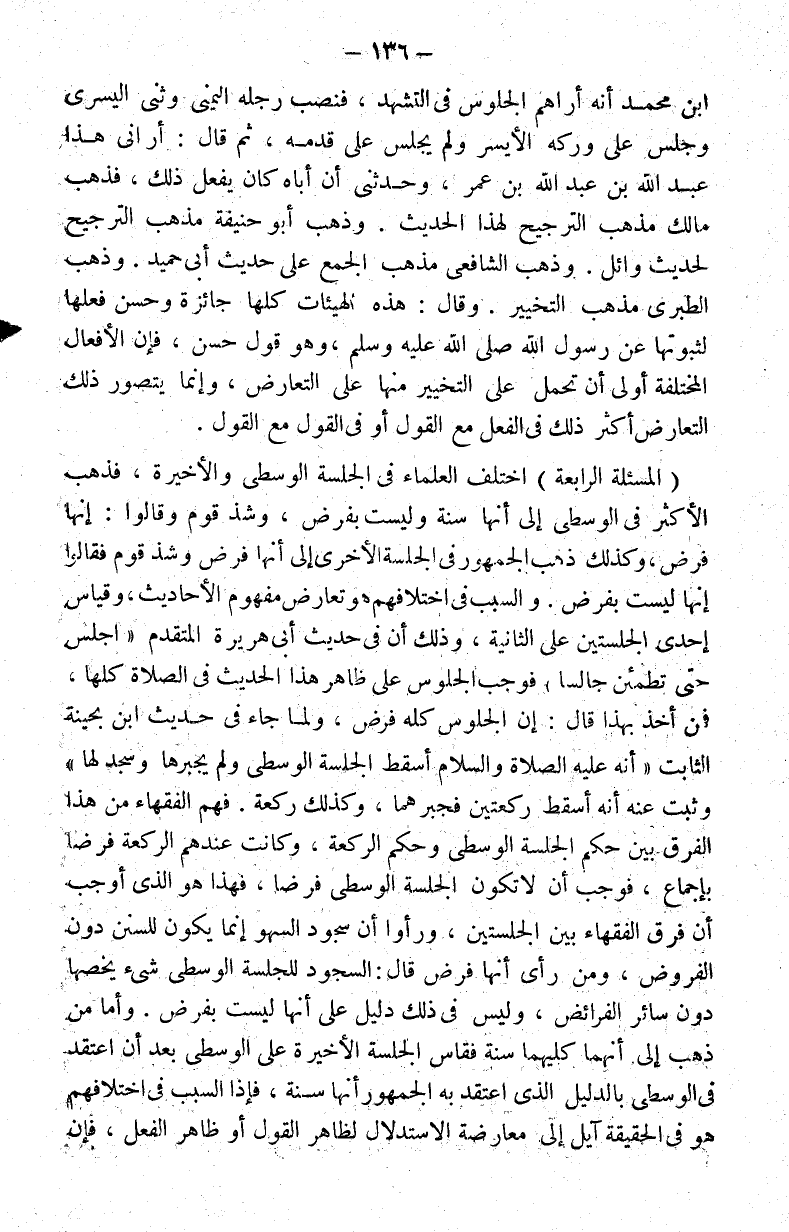 المسألة الرابعة : اختلف العلماء في الجلسة الوسطى والأخيرة فذهب الأكثر في الوسطى إلى أنها سنة وليست بفرض وشذ قوم وقالوا: إنها فرض وكذلك ذهب الجمهور في الجلسة الأخيرة إلى أنها فرض وشذ قوم فقالوا إنها ليست بفرض. والسبب في اختلافهم هو تعارض مفهوم الأحاديث وقياس إحدى الجلستين على الثانية وذلك أن في حديث أبي هريرة المتقدم "اجلس حتى تطمئن جالسا" فوجب الجلوس على ظاهر هذا الحديث في الصلاة كلها فمن أخذ بهذا قال: إن الجلوس كله فرض ولما جاء في حديث ابن بحينة الثابت أنه عليه الصلاة والسلام أسقط الجلسة الوسطى ولم يجبرها وسجد لها وثبت عنه أنه أسقط ركعتين فجبرها وكذلك ركعة. فهم الفقهاء من هذا الفرق بين حكم الجلسة الوسطى وحكم الركعة وكانت عندهم الركعة فرضا بإجماع فوجب أن لا تكون الجلسة الوسطى فرضا فهذا هو الذي أوجب أن فرق الفقهاء بين الجلستين ورأوا أن سجود السهو إنما يكون للسنن دون الفروض ومن رأى أنها فرض قال: السجود للجلسة الوسطى شيء يخصها دون سائر الفرائض وليس في ذلك دليل على أنها ليست بفرض. وأما من ذهب إلى أنهما كليهما سنة فقاس الجلسة الأخيرة على الوسطى بعد أن اعتقد في الوسطى بالدليل الذي اعتقد به الجمهور أنها سنة. فإذا السبب في اختلافهم هو في الحقيقة آيل إلى معارضة الاستدلال لظاهر القول أو ظاهر الفعل فإن