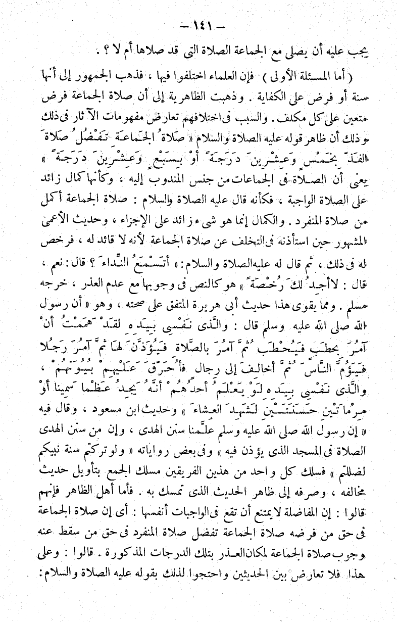 أما المسألة الأولى : فإن العلماء اختلفوا فيها فذهب الجمهور إلى أنها سنة أو فرض على الكفاية. وذهبت الظاهرية إلى أن صلاة الجماعة فرض متعين على كل مكلف. والسبب في اختلافهم تعارض مفهومات الآثار في ذلك وذلك أن ظاهر قوله عليه الصلاة والسلام: "صلاة الجماعة تفضل صلاة الفذ بخمس وعشرين درجة أو بسبع وعشرين درجة" يعني أن الصلاة في جماعات من جنس المندوب إليه وكأنها كمال زائد على الصلاة الواجبة فكأنه قال عليه الصلاة والسلام صلاة الجماعة أكمل من صلاة المنفرد. والكمال إنما هو شيء زائد على الإجزاء وحديث الأعمى المشهور حين استأذنه في التخلف عن صلاة الجماعة لأنه لا قائد له فرخص له في ذلك ثم قال له عليه الصلاة والسلام: "أتسمع النداء؟ قال: نعم, قال: لا أجد لك رخصة" هو كالنص في وجوبها مع عدم العذر, خرجه مسلم. ومما يقوي هذا حديث أبي هريرة المتفق على صحته وهو أن رسول الله صلى الله عليه وسلم قال: "والذي نفسي بيده لقد هممت أن آمر بحطب فيحطب ثم آمر بالصلاة فيؤذن لها ثم آمر رجلا فيؤم الناس ثم أخالف إلى رجال فأحرق عليهم بيوتهم والذي نفسي بيده لو يعلم أحدهم أنه يجد عظما سمينا أو مرماتين حسنتين لشهد العشاء" وحديث ابن مسعود وقال فيه إن رسول الله صلى الله عليه وسلم علمنا سنن الهدى وإن من سنن الهدى الصلاة في المسجد الذي يؤذن فيه وفي بعض رواياته ولو تركتم سنة نبيكم لضللتم فسلك كل واحد من هذين الفريقين مسلك الجمع بتأويل حديث مخالفه وصرفه إلى ظاهر الحديث الذي تمسك به. فأما أهل الظاهر فإنهم قالوا: إن المفاضلة لا يمنع أن تقع في الواجبات أنفسها: أي إن صلاة الجماعة في حق من فرضه صلاة الجماعة تفضل صلاة المنفرد في حق من سقط عنه وجوب صلاة الجماعة لمكان العذر بتلك الدرجات المذكورة. قالوا: وعلى هذا فلا تعارض بين الحديثين واحتجوا لذلك بقوله عليه الصلاة والسلام: