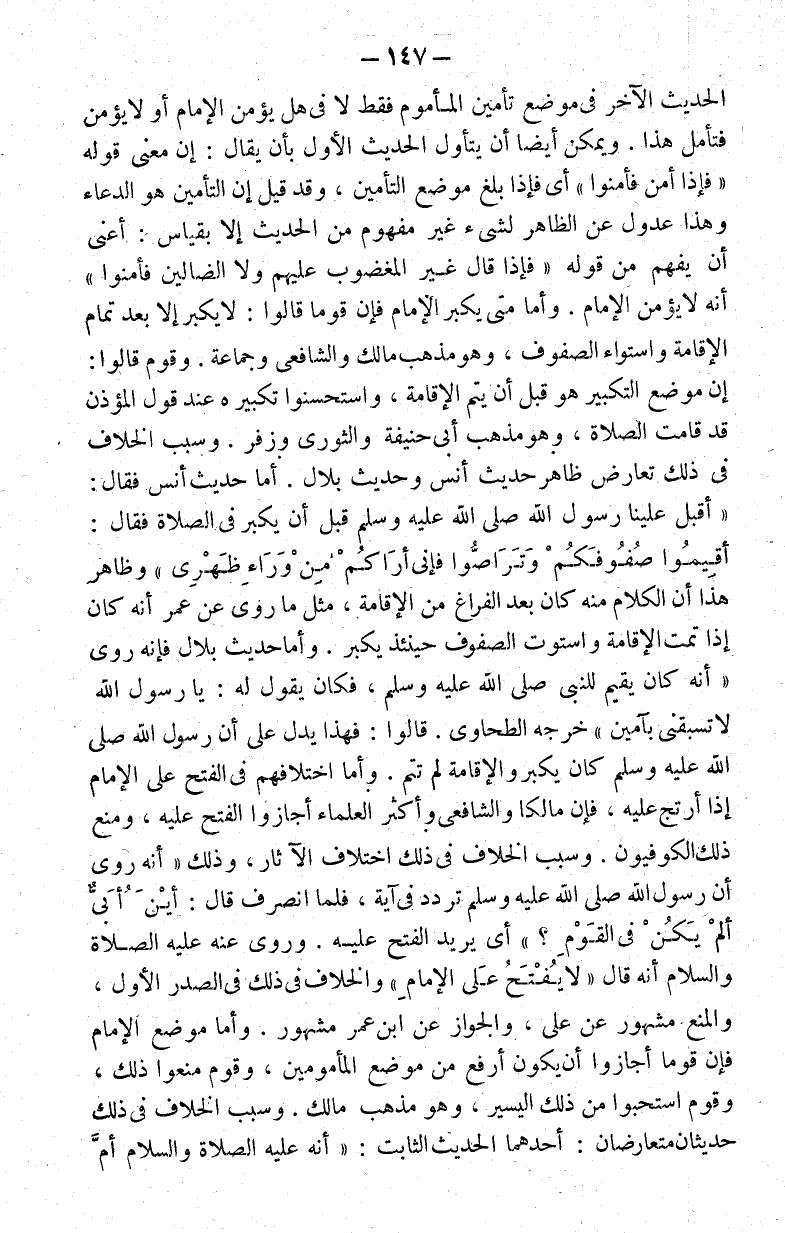 الحديث الآخر في موضع تأمين المأموم فقط لا في هل يؤمن الإمام أو لا يؤمن فتأمل هذا ويمكن أيضا أن يتأول الحديث الأول بأن يقال إن معنى قوله: "فإذا أمن الإمام فأمنوا" أي فإذا بلغ موضع التأمين وقد قيل إن التأمين هو الدعاء وهذا عدول عن الظاهر مفهوم من الحديث إلا بقياس: أعني أن يفهم من قوله: "فإذا قال غير المغضوب عليهم ولا الضالين فأمنوا" أنه لا يؤمن الإمام. وأما متى يكبر الإمام فإن قوما قالوا: لا يكبر إلا بعد تمام الإقامة واستواء الصفوف وهو مذهب مالك والشافعي وجماعة. وقوم قالوا: إن موضع التكبير هو قبل أن يتم الإقامة واستحسنوا تكبيره عند قول المؤذن قد قامت الصلاة وهو مذهب أبي حنيفة والثوري وزفر. وسبب الخلاف في ذلك تعارض ظاهر حديث أنس وحديث بلال. أما حديث أنس فقال: أقبل علينا رسول الله صلى الله عليه وسلم قبل أن يكبر في الصلاة فقال: "أقيموا صفوفكم وتراصوا فإني أراكم من وراء ظهري" وظاهر هذا أن الكلام منه كان بعد الفراغ من الإقامة, مثل ما روى عن عمر أنه كان إذا تمت الإقامة واستوت الصفوف حينئذ يكبر. وأما حديث بلال فإنه روى أنه كان يقيم للنبي صلى الله عليه وسلم فكان يقول له: يا رسول الله لا تسبقني بآمين خرجه الطحاوي. قالوا: فهذا يدل على أن رسول الله صلى الله عليه وسلم كان يكبر والإقامة لم تتم. وأما اختلافهم في الفتح على الإمام إذا ارتج عليه فإن مالكا والشافعي وأكثر العلماء أجازوا الفتح عليه ومنع ذلك الكوفيون. وسبب الخلاف في ذلك اختلاف الآثار وذلك أنه روي أن رسول الله صلى الله عليه وسلم تردد في آية فلما انصرف قال: "أين أبي ألم يكن في القوم؟" أي يريد الفتح عليه. وروي عنه عليه الصلاة والسلام أنه قال: "لا يفتح على الإمام" والخلاف في ذلك في الصدر الأول والمنع مشهور عن علي والجواز عن ابن عمر مشهور. وأما موضع الإمام فإن قوما أجازوا أن يكون أرفع من موضع المأمومين وقوم منعوا ذلك وقوم استحبوا من ذلك اليسير وهو مذهب مالك. وسبب الخلاف في ذلك حديثان متعارضان: أحدهما الحديث الثابت: أنه عليه الصلاة والسلام أم