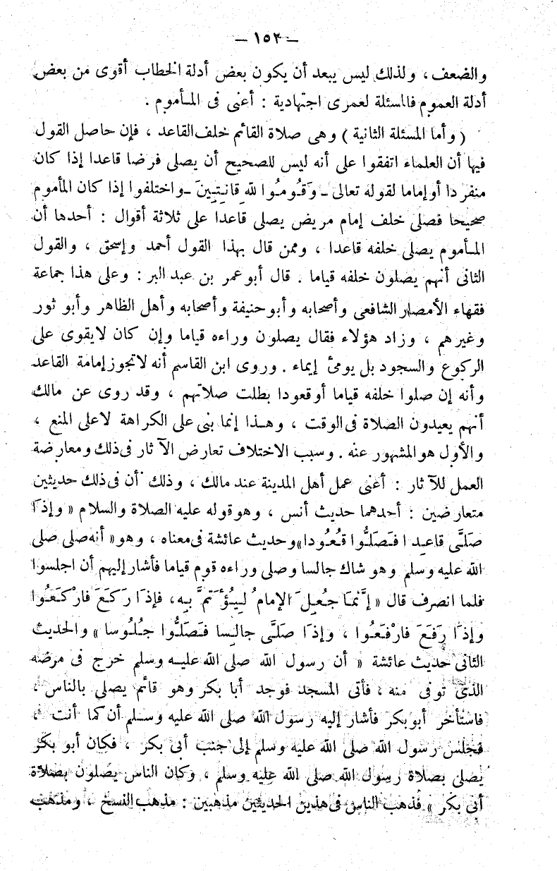 وأما المسألة الثانية: وهي خلف القاعد فإن حاصل القول فيها أن العلماء اتفقوا على أنه ليس للصحيح أن يصلي فرضا قاعدا إذا كان منفردا أو إماما لقوله تعالى: {وَقُومُوا لِلَّهِ قَانِتِينَ} واختلفوا إذا كان المأموم صحيحا فصلى خلف إمام مريض يصلي قاعدا على ثلاثة أقوال: أحدها أن المأموم يصلي خلفه قاعدا وممن قال بهذا القول أحمد وإسحاق والقول الثاني أنهم يصلون خلفه قياما. قال أبو عمر بن عبد البر: وعلى هذا جماعة فقهاء الأمصار الشافعي وأصحابه وأبو حنيفة وأصحابه وأهل الظاهر وأبو ثور وغيرهم وزاد هؤلاء فقالوا يصلون وراءه قياما وإن كان لا يقوى على الركوع والسجود بل يومئ إيماء. وروى ابن القاسم أنه لا تجوز إمامة القاعد وأنه إن صلوا خلفه قياما أو قعودا بطلت صلاتهم وقد روي عن مالك أنهم يعيدون الصلاة في الوقت وهذا إنما بني على الكراهة لا على المنع والأول هو المشهور عنه. وسبب الاختلاف تعارض الآثار في ذلك ومعارضة العمل للآثار: أعني عمل أهل المدينة عند مالك وذلك أن في ذلك حديثين متعارضين: أحدهما حديث أنس وهو قوله عليه الصلاة والسلام: "وإذا صلى قاعدا فصلوا قعودا" وحديث عائشة في في معناه وهو أنه صلى صلى الله عليه وسلم وهو شاك جالسا وصل وراءه قوم قياما فأشار إليهم أن اجلسوا فلما انصرف قال: "إنما جعل الإمام ليؤتم به فإذا ركع فاركعوا وإذا رفع فارفعوا وإذا صلى جالسا فصلوا جلوسا" والحديث الثاني حديث عائشة أن رسول الله صلى الله عليه وسلم خرج في مرضه الذي توفي منه فأتى المسجد فوجد أبا بكر وهو قائم يصلي بالناس فاستأخر أبو بكر فأشار إليه رسول الله صلى الله عليه وسلم أن كما أنت فجلس رسول الله صلى الله عليه وسلم إلى جنب أبي بكر فكان أبو بكر يصلي بصلاة رسول الله صلى الله عليه وسلم وكان الناس يصلون بصلاة أبي بكر فذهب الناس في هذين الحديثين مذهبين: مذهب النسخ ومذهب