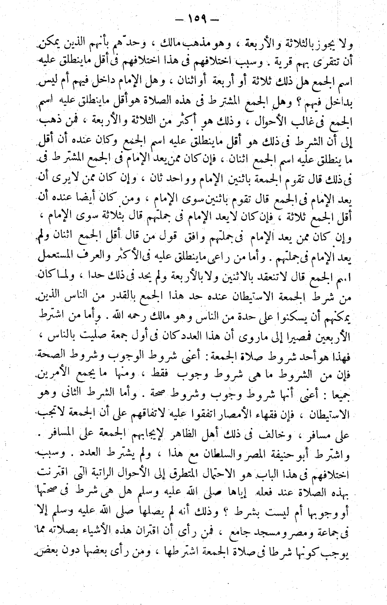 ولا يجوز بالثلاثة والأربعة وهو مذهب مالك وحدهم بأنهم الذين يمكن أن تتقرى بهم قرية. وسبب اختلافهم في هذا اختلافهم في أقل ما ينطلق عليه اسم الجمع هل ذلك ثلاثة أو أربعة أو اثنان وهل الإمام داخل فيهم أم ليس بداخل فيهم؟ وهل الجمع المشترط في هذه الصلاة هو أقل ما ينطلق عليه اسم الجمع في غالب الأحوال وذلك هو أكثر من الثلاثة والأربعة فمن ذهب إلى أن الشرط في ذلك هو أقل ما ينطلق عليه اسم الجمع وكان عنده أن أقل ما ينطلق عليه اسم الجمع اثنان فإن كان ممن يعد الإمام في الجمع المشترط في ذلك قال تقوم الجمعة باثنين الإمام وواحد ثان وإن كان ممن لا يرى أن يعد الإمام في الجمع قال تقوم باثنين سوى الإمام ومن كان أيضا عنده أن أقل الجمع ثلاثة سوى الإمام وإن كان ممن يعد الإمام في جملتهم. وافق قول من قال أقل الجمع اثنان ولم يعد الإمام في جملتهم وأما من راعى ما ينطلق عليه في الأكثر والعرف المستعمل اسم الجمع قال بالاثنين ولا بالأربعة ولم يحد في ذلك حدا ولما كان من شرط الجمعة الاستيطان عنده حد هذا الجمع بالقدر من الناس الذين يمكنهم أن يسكنوا على حدة من الناس وهو مالك رحمه الله. وأما من اشترط الأربعين فمصيرا إلى ما روي أن هذا العدد كان في أول جمعة صليت بالناس فهذا هو أحد شروط صلاة الجمعة: أعني شروط الوجوب وشروط الصحة فإن من الشروط ما هي شروط وجوب فقط ومنها ما يجمع الأمرين جميعا: أعني أنها شروط وجوب وشروط صحة. وأما الشرط الثاني وهو الاستيطان فإن فقهاء الأمصار اتفقوا عليه لاتفاقهم على أن الجمعة لا تجب على المسافر عدا في ذلك أهل الظاهر لإيجابهم الجمعة على المسافر. واشترط أبو حنيفة المصر والسلطان مع هذا ولم يشترط العدد. وسبب اختلافهم في هذا الباب هو الاحتمال المتطرق إلى الأحوال الراتبة التي اقترنت بهذه الصلاة عند فعله إياها صلى الله عليه وسلم هل هي شرط في صحتها أو وجوبها أم ليست بشرط؟ وذلك أنه لم يصلها صلى الله عليه وسلم إلا في جماعة ومصر ومسجد جامع فمن رأى أن اقتران هذه الأشياء بصلاته مما يوجب كونها شرطا في صلاة الجمعة اشترطها ومن رأى بعضها دون بعض