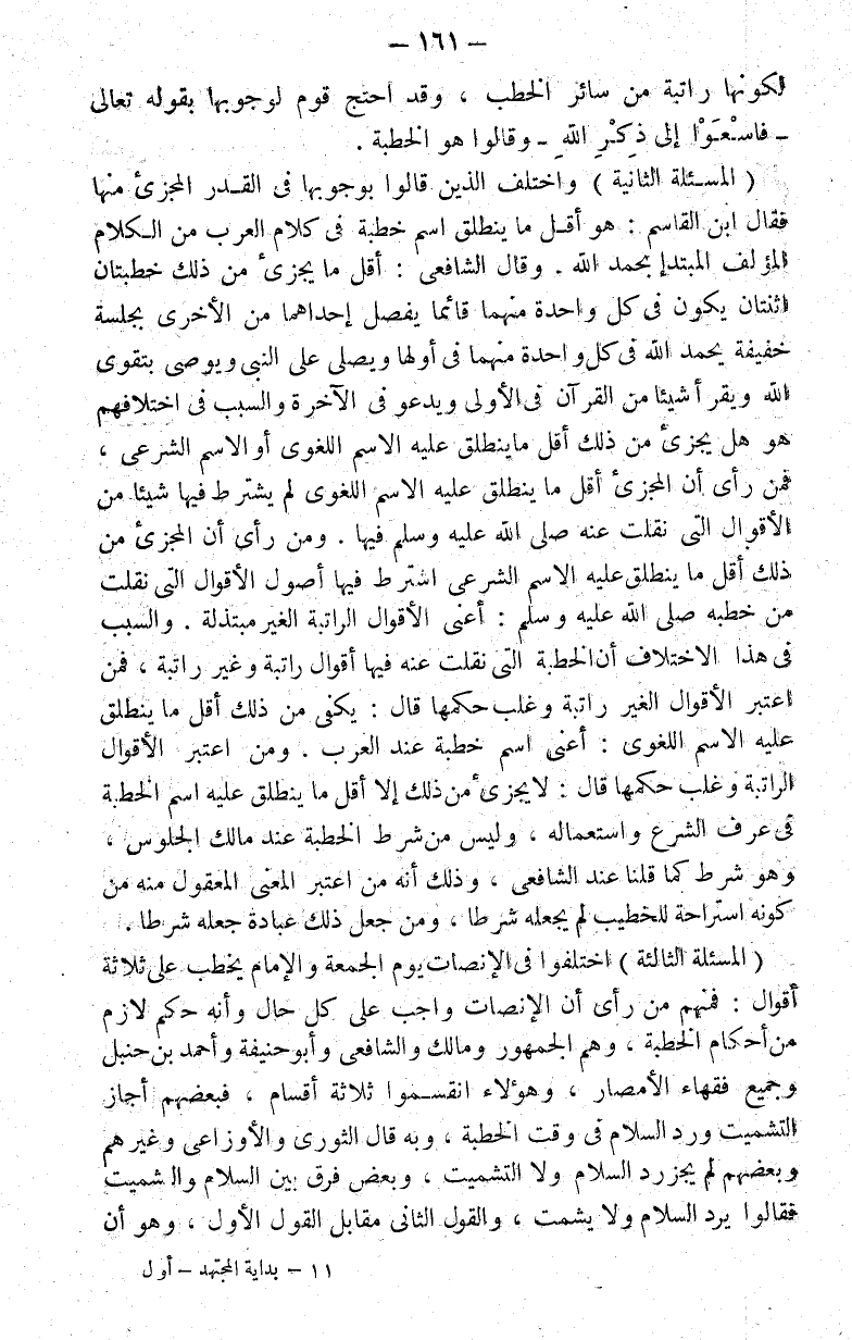 المسألة الثانية : واختلف الذين قالوا بوجوبها في القدر المجزئ منها فقال ابن القاسم: هو أقل ما ينطلق عليه اسم خطبة في كلام العرب من الكلام المؤلف المبدوء بحمد الله. وقال الشافعي: أقل ما يجزئ من ذلك خطبتان اثنتان يكون في كل واحدة منهما قائما يفصل إحداهما من الأخرى بجلسة خفيفة يحمد الله في كل واحدة منهما في على النبي صلى الله عليه وسلم ويوصي بتقوى الله ويقرأ شيئا من القرآن في الأولى ويدعو في الآخرة والسبب في اختلافهم هو هل يجزئ من ذلك أقل ما ينطلق عليه الاسم اللغوي أو الاسم الشرعي فمن رأى أن المجزئ أقل ما ينطلق عليه الاسم اللغوي لم يشترط فيها شيئا من الأقوال التي نقلت عنه صلى الله عليه وسلم فيها. ومن رأى أن المجزئ من ذلك أقل ما ينطلق عليه الاسم الشرعي اشترط فيها أصول الأقوال التي نقلت من خطبه صلى الله عليه وسلم: أعني الأقوال الراتبة الغير المتبدلة. والسبب في هذا الاختلاف أن الخطبة التي نقلت عنه فيها أقوال راتبة وغير راتبة فمن اعتبر الأقوال الغير راتبة وغلب حكمها قال: يكفي من ذلك أقل ما ينطلق عليه الاسم اللغوي: أعني اسم خطبة عند العرب. ومن اعتبر الأقوال الراتبة وغلب حكمها قال: لا يجزئ من ذلك إلا أقل ما ينطلق عليه اسم الخطبة في عرف الشرع واستعماله وليس من شرط الخطبة عند مالك الجلوس وهو شرط كما قلنا عند الشافعي وذلك أنه من اعتبر المعنى المعقول منه من كونه استراحة للخطيب لم يجعله شرطا ومن جعل ذلك عبادة جعله شرطا.