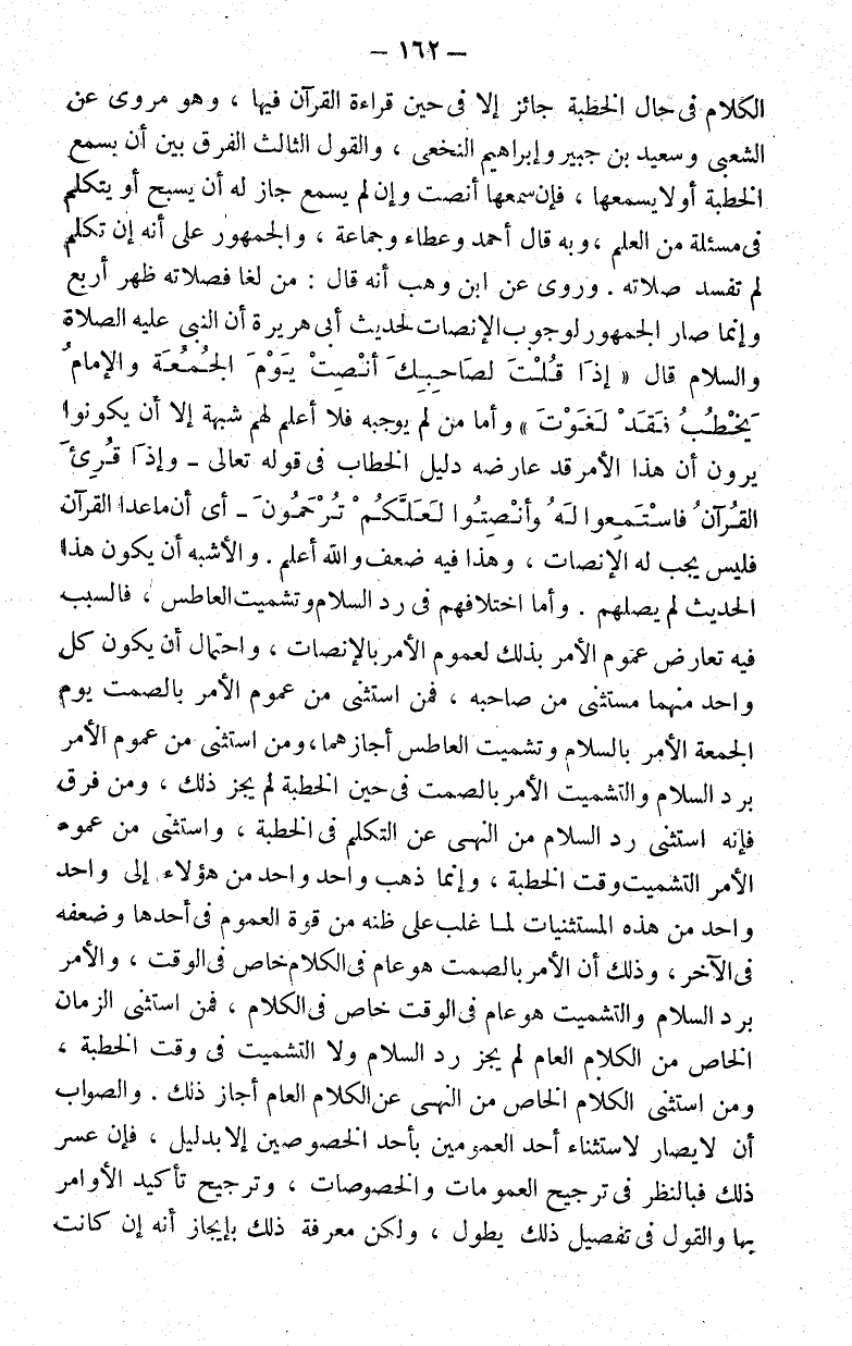 الكلام في حال الخطبة جائز إلا في حين قراءة القرآن فيها وهو مروي عن الشعبي وسعيد بن جبير وإبراهيم النخعي والقول الثالث الفرق بين أن يسمع الخطبة أو لا يسمعها فإن سمعها أنصت وإن لم يسمع جاز له أن يسبح أو يتكلم في مسألة من العلم وبه قال أحمد وعطاء وجماعة والجمهور على أنه إن تكلم لم تفسد صلاته. وروي عن ابن وهب أنه قال: من لغا فصلاته ظهر أربع وإنما صار الجمهور لوجوب الإنصات لحديث أبي هريرة أن النبي عليه الصلاة والسلام قال: "إذا قلت لصاحبك أنصت يوم الجمعة والإمام يخطب فقد لغوت" وأما من لم يوجبه فلا أعلم لهم شبهة إلا أن أن هذا الأمر قد عارضه دليل الخطاب في قوله تعالى: {وَإِذَا قُرِئَ الْقُرْآنُ فَاسْتَمِعُوا لَهُ وَأَنْصِتُوا لَعَلَّكُمْ تُرْحَمُونَ} أي أن ما عدا القرآن فليس يجب له الإنصات وهذا فيه ضعف والله أعلم. والأشبه أن يكون هذا الحديث لم يصلهم. وأما اختلافهم في رد السلام وتشميت العاطس فالسبب فيه تعارض عموم الأمر بذلك لعموم الأمر بالإنصات واحتمال أن يكون كل واحد منهما مستثنى من صاحبه فمن استثنى من عموم الأمر بالصمت يوم الجمعة الأمر بالسلام وتشميت العاطس أجازهما ومن استثنى من عموم الأمر برد السلام والتشميت الأمر بالصمت في حين الخطبة لم يجز ذلك ومن فرق فإنه استثنى رد السلام من النهي عن التكلم في الخطبة واستثنى من عموم الأمر التشميت وقت الخطبة وإنما ذهب واحد واحد من هؤلاء إلى واحد واحد من هذه المستثنيات لما غلب على ظنه من قوة العموم في أحدها وضعفه في الآخر وذلك أن الأمر بالصمت هو عام في الكلام خاص في الوقت والأمر برد السلام والتشميت هو عام في الوقت خاص في الكلام فمن استثنى الزمن الخاص من الكلام العام لم يجز رد السلام ولا التشميت في وقت الخطبة ومن استثنى الكلام الخاص من النهي عن الكلام العام أجاز ذلك. والصواب ألا يصار لاستثناء أحد العمومين بأحد الخصوصين إلا بدليل فإن عسر ذلك فبالنظر في ترجيح العمومات والخصوصات وترجيح تأكيد الأوامر بها والقول في تفصيل ذلك يطول, ولكن معرفة ذلك بإيجاز أنه إن كانت