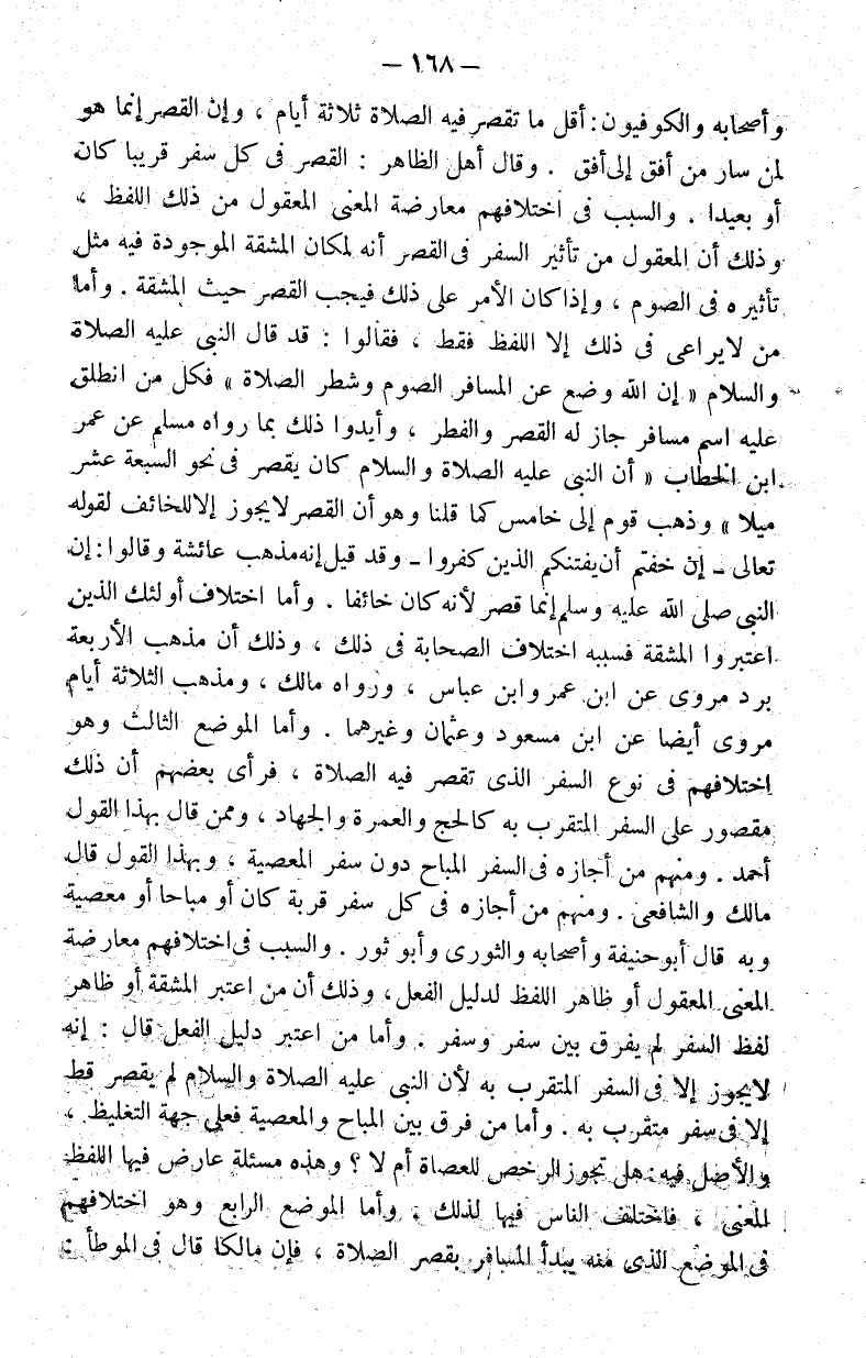 وأصحابه والكوفيون: أقل ما تقصر فيه الصلاة ثلاثة أيام وإن القصر إنما هو لمن سار من أفق إلى أفق. وقال أهل الظاهر: القصر في كل سفر قريبا كان أو بعيدا. والسبب في اختلافهم معارضة المعنى المعقول من ذلك اللفظ وذلك أن المعقول من تأثير السفر في القصر أنه لمكان المشقة الموجودة فيه مثل تأثيره في الصوم وإذا كان الأمر على ذلك فيجب القصر حيث المشقة. وأما من لا يراعي في ذلك إلا اللفظ فقط فقالوا: قد قال النبي عليه الصلاة والسلام: "إن الله وضع عن المسافر الصوم وشطر الصلاة" فكل من انطلق عليه اسم مسافر جاز له القصر والفطر وأيدوا ذلك بما رواه مسلم عن عمر بن الخطاب أن النبي عليه الصلاة والسلام كان يقصر في نحو السبعة عشر ميلا وذهب قوم إلى خامس كما قلنا وهو أن القصر لا يجوز إلا للخائف لقوله تعالى: {إِنْ خِفْتُمْ أَنْ يَفْتِنَكُمُ الَّذِينَ كَفَرُوا} وقد قيل إنه مذهب عائشة وقالوا: إن النبي صلى الله عليه وسلم إنما قصر لأنه كان خائفا. الذين اعتبروا المشقة فسببه اختلاف الصحابة في ذلك وذلك أن مذهب الأربعة برد روي عن ابن عمر وابن عباس ورواه مالك ومذهب الثلاثة أيام مروي أيضا عن ابن مسعود وعثمان وغيرهما. وأما الموضع الثالث وهو اختلافهم في نوع السفر الذي تقصر فيه الصلاة فرأى بعضهم أن ذلك مقصور على السفر المتقرب به كالحج والعمرة والجهاد وممن قال بهذا القول أحمد. ومنهم من أجازه في السفر المباح دون سفر المعصية وبهذا القول قال مالك والشافعي. ومنهم من أجازه في كل سفر قربة كان أو مباحا أو معصية وبه قال أبو حنيفة وأصحابه والثوري وأبو ثور. والسبب في اختلافهم معارضة المعنى المعقول أو ظاهر اللفظ لدليل الفعل وذلك أن من اعتبر المشقة أو ظاهر لفظ السفر لم يفرق بين سفر وسفر. وأما من اعتبر دليل الفعل قال: إنه لا يجوز إلا في السفر المتقرب به لأن النبي عليه الصلاة والسلام لم يقصر قط إلا في سفر متقرب به. وأما من فرق بين المباح والمعصية فعلى جهة التغليظ والأصل فيه: هل تجوز الرخصة للعصاة أم لا؟ وهذه مسألة عارض فيها اللفظ المعنى فاختلف الناس فيها لذلك. وأما الموضع الرابع وهو اختلافهم في الموضع الذي منه يبدأ المسافر بقصر الصلاة فإن مالكا قال في الموطأ: