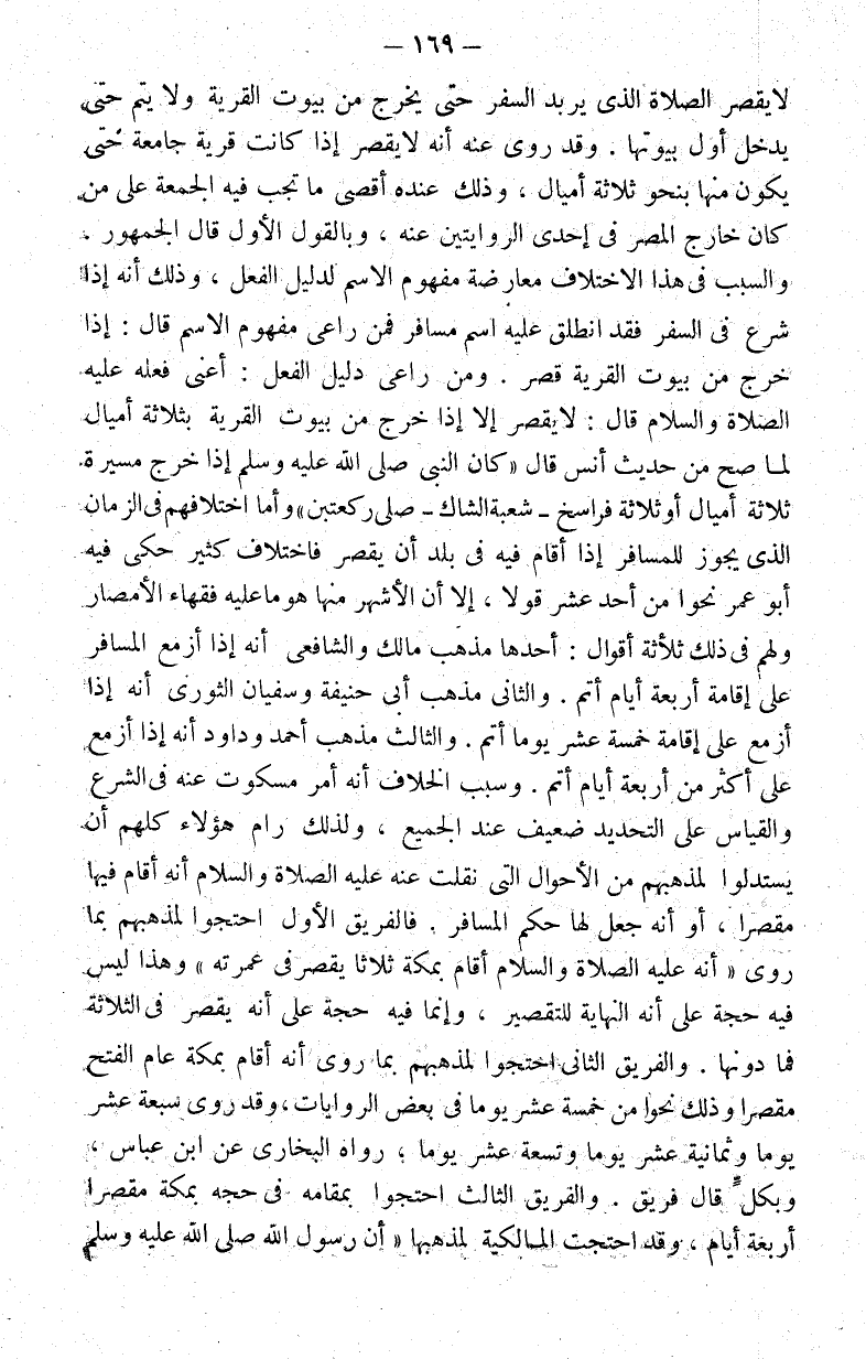 لا يقصر الصلاة الذي يريد السفر حتى يخرج من بيوت القرية ولا يتم حتى يدخل أول بيوتها وقد روي عنه أنه لا يقصر إذا كانت قرية جامعة حتى يكون منها بنحو ثلاثة أميال وذلك عنده أقصى ما تجب فيه الجمعة على من كان خارج المصر في إحدى الروايتين عنه وبالقول الأول قال الجمهور. والسبب في هذا الاختلاف معارضة مفهوم الاسم لدليل الفعل وذلك أنه إذا شرع في السفر فقد انطلق عليه اسم مسافر فمن راعى مفهوم الاسم قال: إذا خرج من بيوت القرية قصر. ومن راعى دليل الفعل: أعني فعله عليه الصلاة والسلام قال: لا يقصر إلا إذا خرج من بيوت القرية بثلاثة أميال لما صح من حديث أنس قال كان النبي صلى الله عليه وسلم إذا خرج مسيرة ثلاثة أميال أو ثلاثة فراسخ- شعبة الشاك- صلى ركعتين وأما اختلافهم في الزمان الذي يجوز للمسافر إذا أقام فيه في بلد أن يقصر فاختلاف كثير حكى فيه أبو عمر نحوا من أحد عشر قولا إلا أن الأشهر منها هو ما عليه فقهاء الأمصار ولهم في ذلك ثلاثة أقوال: أحدها مذهب مالك والشافعي أنه إذا أزمع المسافر على إقامة أربعة أيام أتم. والثاني مذهب أبي حنيفة وسفيان الثوري أنه إذا أزمع على إقامة خمسة عشر يوما أتم. والثالث مذهب أحمد وداود أنه إذا أزمع على أكثر من أربعة أيام أتم. وسبب الخلاف أنه أمر مسكوت عنه في الشرع والقياس على التحديد ضعيف عند الجميع ولذلك رام هؤلاء كلهم أن يستدلوا لمذهبهم من الأحوال التي نقلت عنه عليه الصلاة والسلام أنه أقام فيها مقصرا أو أنه جعل لها حكم المسافر. فالفريق الأول احتجوا بمذهبهم بما روي أنه عليه الصلاة والسلام أقام بمكة ثلاثا يقصر في عمرته وهذا ليس فيه حجة على أنه النهاية للتقصير. وإنما فيه حجة على أنه يقصر في الثلاثة فما دونها. والفريق الثاني احتجوا لمذهبهم بما روي أنه أقام بمكة عام الفتح مقصرا وذلك نحوا من خمسة عشر يوما في بعض الروايات وقد روي سبعة عشر يوما وثمانية عشر يوما وتسعة عشر يوما رواه البخاري عن ابن عباس وبكل قال فريق. والفريق الثالث احتجوا بمقامه في حجه بمكة مقصرا أربعة أيام وقد احتجت المالكية لمذهبها أن رسول الله صلى الله عليه وسلم