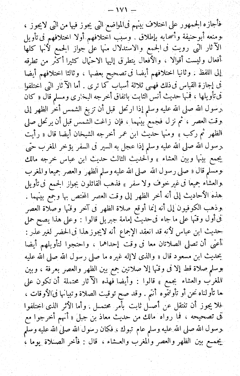 فأجازه الجمهور على اختلاف بينهم في المواضع التي يجوز فيها من التي لا يجوز ومنعه أبو حنيفة وأصحابه بإطلاق. وسبب اختلافهم أولا اختلافهم في تأويل الآثار التي رويت في الجمع والاستدلال منها على جواز الجمع لأنها كلها أفعال وليست أقوالا والأفعال يتطرق إليها الاحتمال كثيرا أكثر من تطرقه إلى اللفظ. وثانيا اختلافهم أيضا في تصحيح بعضها وثالثا اختلافهم أيضا في إجازة القياس في ذلك فهي ثلاثة أسباب كما ترى. أما الآثار التي اختلفوا في تأويلها فمنها حديث أنس الثابت باتفاق أخرجه البخاري ومسلم قال كان رسول الله صلى الله عليه وسلم إذا ارتحل قبل أن تزيغ الشمس أخر الظهر إلى وقت العصر ثم نزل فجمع بينهما فإن زاغت الشمس قبل أن يرتحل صلى الظهر ثم ركب ومنها حديث ابن عمر أخرجه الشيخان أيضا قال رأيت رسول الله صلى الله عليه وسلم إذا عجل به السير في السفر يؤخر المغرب حتى يجمع بينها وبين العشاء والحديث الثالث حديث ابن عباس خرجه مالك ومسلم قال صلى رسول الله صلى الله عليه وسلم الظهر والعصر جميعا والمغرب والعشاء جميعا في غير خوف ولا سفر فذهب القائلون بجواز الجمع في تأويل هذه الأحاديث إلى أنه أخر الظهر إلى وقت العصر المختص بها وجمع بينهما. وذهب الكوفيون إلى أنه إنما أوقع صلاة الظهر في آخر وقتها وصلاة العصر في أول وقتها على ما جاء في حديث إمامة جبريل قالوا: وعلى هذا يصح حمل حديث ابن عباس لأنه قد انعقد الإجماع أنه لا يجوز هذا في الحضر لغير عذر: أعني أن تصلى الصلاتان معا في وقت إحداهما واحتجوا لتأويلهم أيضا بحديث ابن مسعود قال والذي لا إله غيره ما صلى رسول الله صلى الله عليه وسلم صلاة قط إلا في وقتها إلا صلاتين جمع بين الظهر والعصر بعرفة وبين المغرب والعشاء بجمع قالوا: وأيضا فهذه الآثار محتملة أن تكون على ما تأولناه نحن أو تأولتموه أنتم. وقد صح توقيت الصلاة وتبيانها في الأوقات فلا يجوز أن تنتقل عن أصل ثابت بأمر محتمل. أما الأثر الذي اختلفوا في تصحيحه فما رواه مالك من حديث معاذ بن جبل أنهم خرجوا مع رسول الله صلى الله عليه وسلم عام تبوك فكان رسول الله صلى الله عليه وسلم يجمع بين الظهر والعصر والمغرب والعشاء قال: فأخر الصلاة يوما,