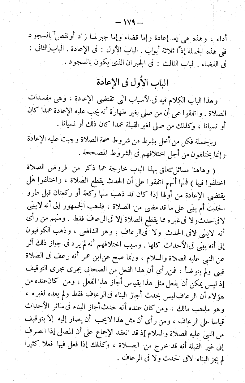 أداء وهذه هي إما إعادة وإما قضاء وإما جبر لما زاد أو نقص بالسجود ففي هذه الجملة إذا ثلاثة أبواب. الباب الأول: في الإعادة. الباب الثاني: في القضاء. الباب الثالث: في الجبران الذي يكون بالسجود.