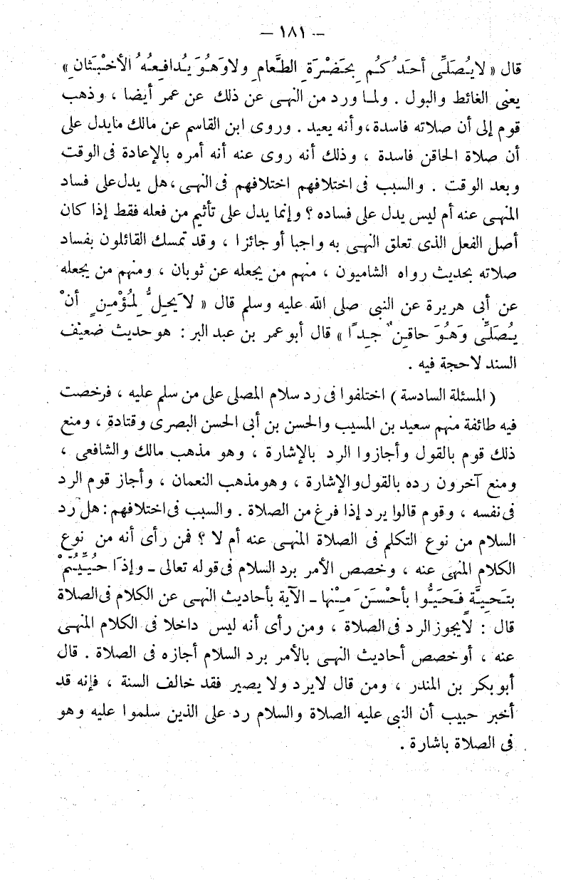 المسألة السادسة : اختلفوا في رد سلام المصلي على من سلم عليه فرخصت فيه طائفة منهم سعيد بن المسيب والحسن بن أبي الحسن البصري وقتادة ومنع ذلك قوم بالقول وأجازوا الرد بالإشارة وهو مذهب مالك والشافعي ومنع آخرون رده بالقول والإشارة وهو مذهب النعمان وأجاز قوم الرد في نفسه وقوم قالوا يرد إذا فرغ من الصلاة. والسبب في اختلافهم: هل رد السلام من نوع التكلم في الصلاة المنهي عنه أم لا؟ فمن رأى أنه من نوع الكلام المنهي عنه وخصص الأمر برد السلام في قوله تعالى: {وَإِذَا حُيِّيتُمْ بِتَحِيَّةٍ فَحَيُّوا بِأَحْسَنَ مِنْهَا} الآية بأحاديث النهي عن الكلام في الصلاة قال: لا يجوز الرد في الصلاة ومن رأى أنه ليس داخلا في الكلام المنهي عنه أو خصص أحاديث النهي بالأمر برد السلام أجازه في الصلاة. قال أبو بكر بن المنذر ومن قال لا يرد ولا يصير فقد خالف السنة فإنه قد أخبر حبيب أن النبي عليه الصلاة والسلام رد على الذين سلموا عليه وهو في الصلاة بإشارة.