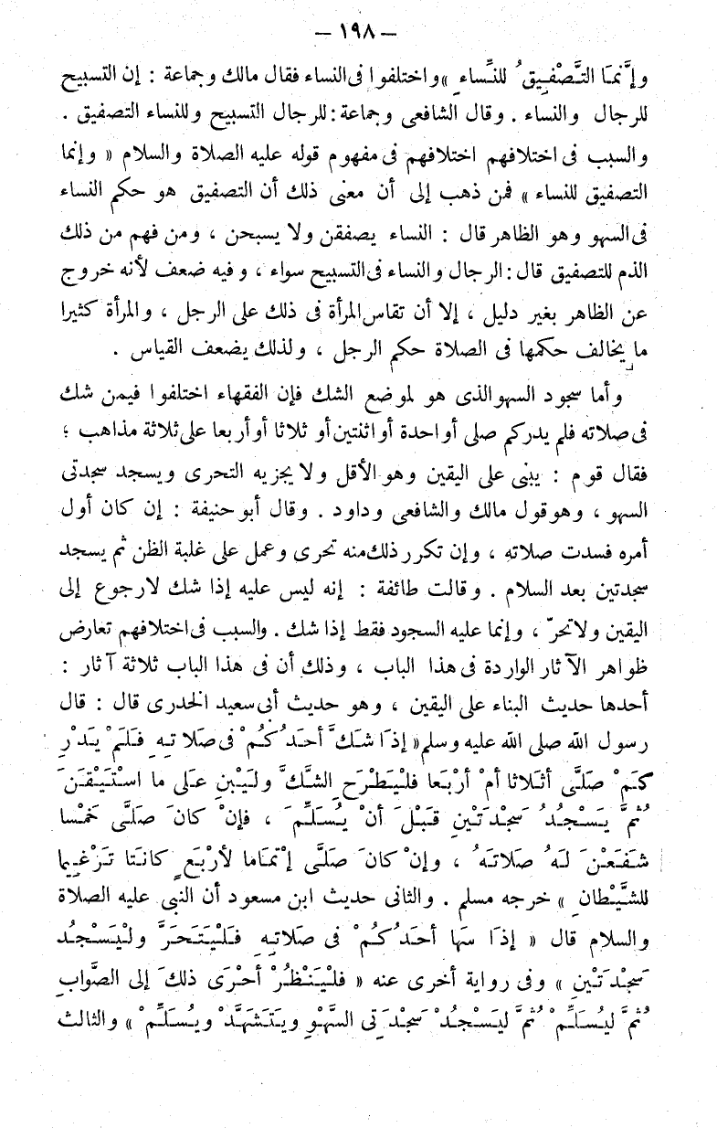 وإنما التصفيق للنساء" واختلفوا في النساء فقال مالك وجماعة: إن التسبيح للرجال والنساء. وقال الشافعي وجماعة: للرجال التسبيح وللنساء التصفيق. والسبب في اختلافهم اختلافهم في مفهوم قوله عليه الصلاة والسلام: "وإنما التصفيق للنساء" فمن ذهب إلى أن معنى ذلك أن التصفيق هو حكم النساء في السهو وهو الظاهر قال: النساء يصفقن ولا يسبحن ومن فهم من ذلك الذم للتصفيق قال: الرجال والنساء في التسبيح سواء وفيه ضعف لأنه خروج عن الظاهر بغير دليل إلا أن تقاس المرأة في ذلك على الرجل والمرأة كثيرا ما يخالف حكمها في الصلاة حكم الرجل ولذلك يضعف القياس.