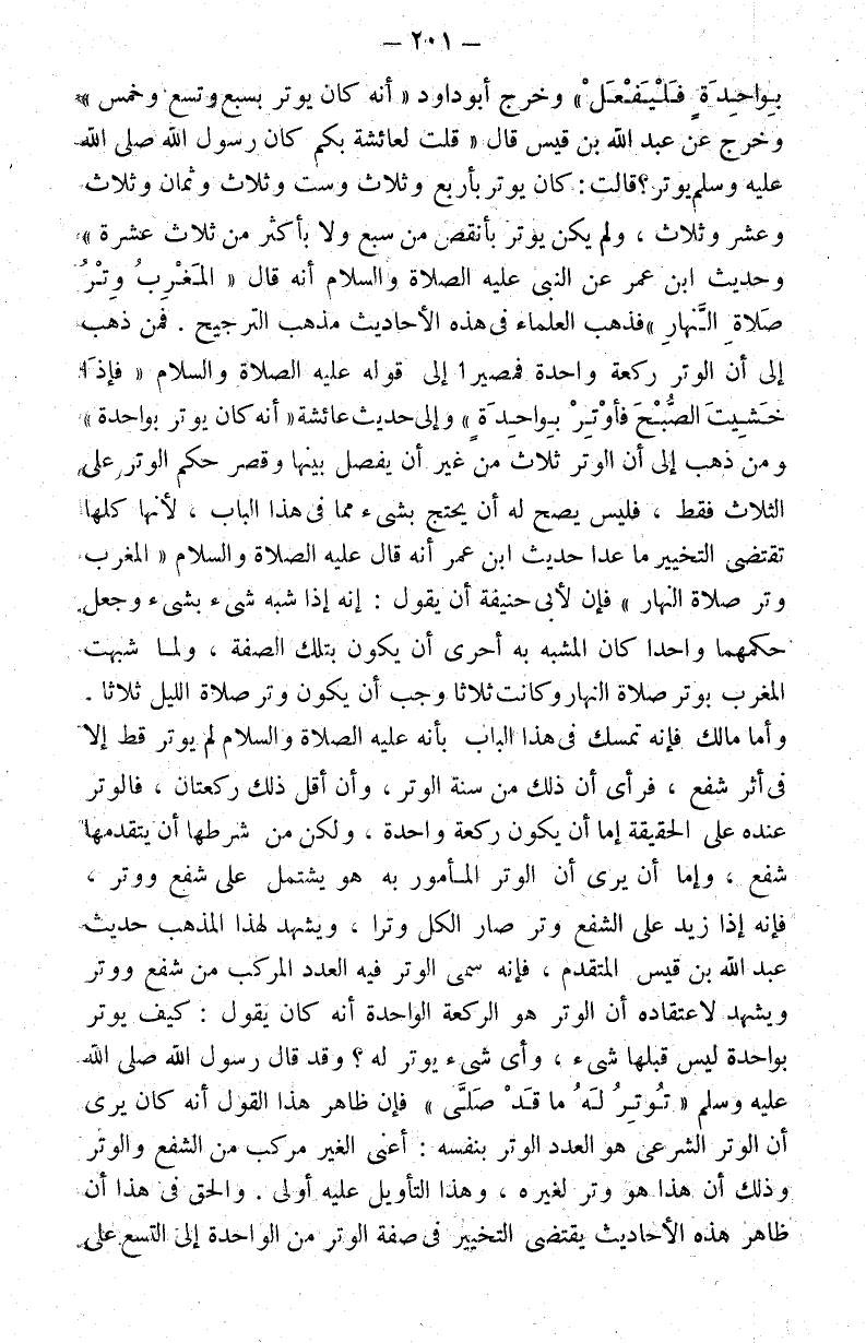 بواحدة فليفعل" وخرج أبو داود أنه كان يوتر بسبع وتسع وخمس وخرج عن عبد الله بن قيس قال: قلت لعائشة بكم كان رسول الله صلى الله عليه وسلم يوتر؟ قالت: كان يوتر بأربع وثلاث وست وثلاث وثمان وثلاث وعشر وثلاث ولم يكن يوتر بأنقص من سبع ولا بأكثر من ثلاث عشرة وحديث ابن عمر عن النبي عليه الصلاة والسلام أنه قال: "المغرب وتر صلاة النهار" فذهب العلماء في هذه الأحاديث مذهب الترجيح. فمن ذهب إلى أن الوتر ركعة واحدة فمصيرا إلى قوله عليه الصلاة والسلام: "فإذا خشيت الصبح فأوتر بواحدة" وإلى حديث عائشة أنه كان يوتر بواحدة ومن ذهب إلى أن الوتر ثلاث من غير أن يفصل بينها وقصر حكم الوتر على الثلاث فقط فليس يصح له أن يحتج بشيء مما في هذا الباب لأنها كلها تقتضي التخيير ما عدا حديث ابن عمر أنه قال عليه الصلاة والسلام: "المغرب وتر صلاة النهار" فإن لأبي حنيفة أن يقول: إنه إذا شبه شيء بشيء وجعل حكمهما واحدا كان المشبه به أحرى أن يكون بتلك الصفة ولما شبهت المغرب بوتر صلاة النهار وكانت ثلاثا وجب أن يكون وتر صلاة الليل ثلاثا. وأما مالك فإنه تمسك في هذا الباب بأنه عليه الصلاة والسلام لم يوتر قط إلا في أثر شفع فرأى أن ذلك من سنة الوتر وأن أقل ذلك ركعتان فالوتر عنده على الحقيقة إما إن يكون ركعة واحدة ولكن من شرطها أن يتقدمها شفع وإما أن يرى أن الوتر المأمور به هو يشتمل على شفع ووتر فإنه إذا زيد على الشفع وتر صار الكل وترا ويشهد لهذا المذهب حديث عبد الله بن قيس المتقدم فإنه سمى الوتر فيه العدد المركب من شفع ووتر ويشهد لاعتقاده أن الوتر هو الركعة الواحدة أنه كان يقول: كيف يوتر بواحدة ليس قبلها شيء وأي شيء يوتر له؟ وقد قال رسول الله صلى الله عليه وسلم: "توتر له ما قد صلى" فإن ظاهر هذا القول أنه كان يرى أن الوتر الشرعي هو عدد الوتر بنفسه: أعني الغير مركب من الشفع والوتر ذلك أن هذا هو وتر لغيره وهذا التأويل عليه أولى. والحق في هذا أن ظاهر هذه الأحاديث يقتضي التخيير في صفة الوتر من الواحدة إلى التسع على