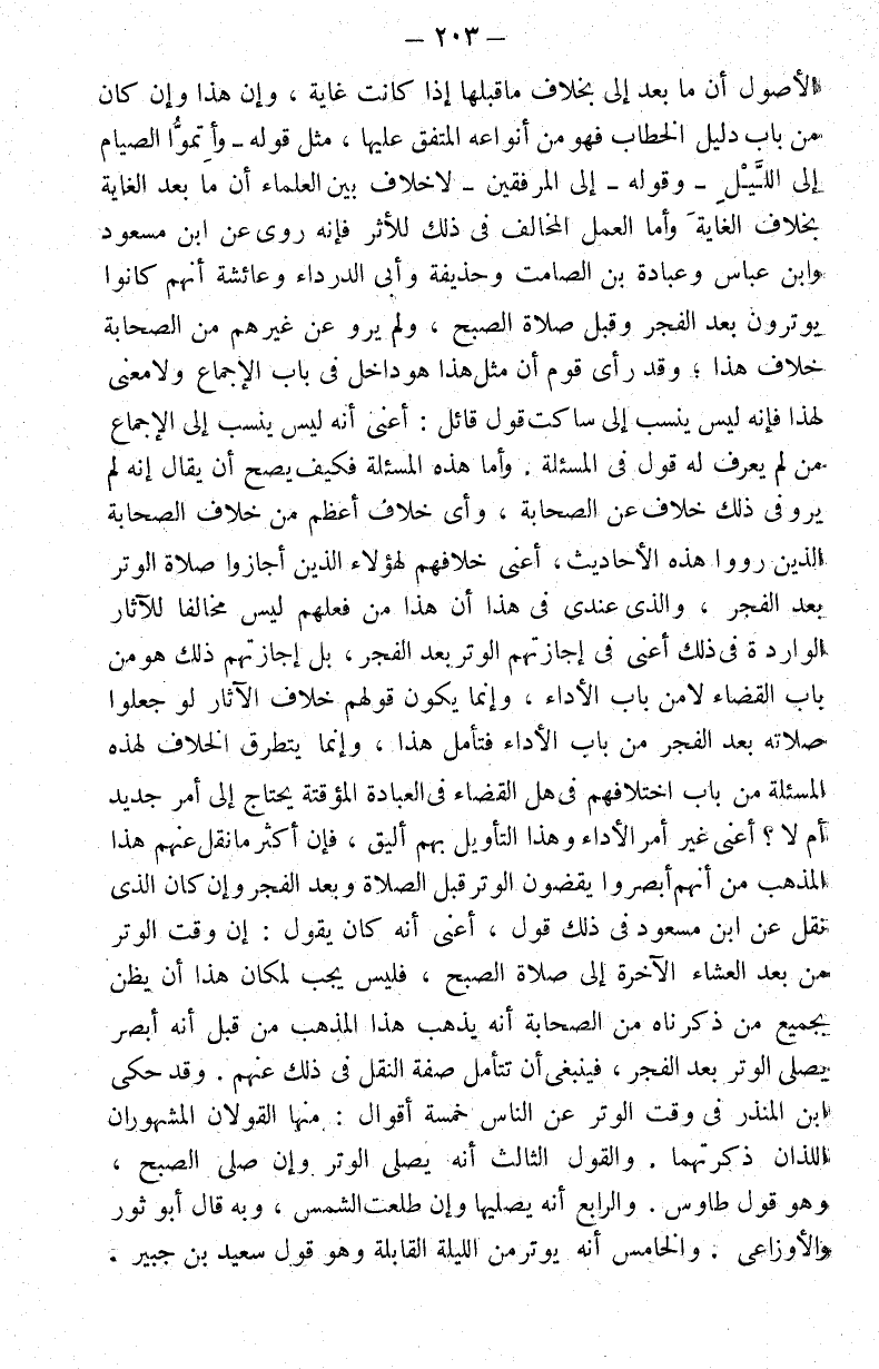 الأصول أن ما بعد إلى بخلاف ما قبلها إذا كانت غاية وأن هذا وإن كان من باب دليل الخطاب فهو من أنواعه المتفق عليها مثل قوله: {ثُمَّ أَتِمُّوا الصِّيَامَ إِلَى اللَّيْلِ} وقوله: {إِلَى الْمَرَافِقِ} لا خلاف بين العلماء أن ما بعد الغاية بخلاف ما قبل الغاية وأما العمل المخالف في ذلك للأثر فإنه روي عن ابن مسعود وابن عباس وعباده بن الصامت وحذيفة وأبي الدرداء وعائشة أنهم كانوا يوترون بعد الفجر وقبل صلاة الصبح ولم يرو عن غيرهم من الصحابة خلاف هذا وقد رأى قوم أن مثل هذا هو داخل في باب الإجماع ولا معنى لهذا فإنه ليس ينسب إلى ساكت قول قائل: أعني أنه ليس ينسب إلى الإجماع من لم يعرف له قول في المسألة. وأما هذه المسألة فكيف يصح أن يقال إنه لم يرو في ذلك خلاف عن الصحابة ونصف خلاف أعظم من خلاف الصحابة الذين رووا هذه الأحاديث أعني خلافهم لهؤلاء الذين أجازوا صلاة الوتر بعد الفجر والذي عندي في هذا أن هذا من فعلهم ليس مخالفا الآثار الواردة في ذلك أعني في إجازتهم الوتر بعد الفجر بل إجازتهم ذلك هو من باب القضاء لا من باب الأداء وإنما يكون قولهم خلاف الآثار لو جعلوا صلاته بعد الفجر من باب الأداء فتأمل هذا وإنما يتطرق الخلاف لهذه المسألة من باب اختلافهم في هل القضاء في العبادة المؤقتة يحتاج إلى أمر جديد أم لا؟ أعني غير أمر الأداء وهذا التأويل بهم أليق فإن أكثر ما الوتر قبل الصلاة وبعد الفجر وإن كان الذي نقل عن ابن مسعود في ذلك قول أعني أنه كان يقول: إن وقت الوتر من بعد العشاء الآخرة إلى صلاة الصبح فليس يجب لمكان هذا أن يظن بجميع من ذكرناه من الصحابة أنه يذهب هذا المذهب من قبل أنه أبصر يصلي الوتر بعد الفجر فينبغي أن تتأمل صفة النقل في ذلك عنهم وقد حكى ابن المنذر في وقت الوتر عن الناس خمسة أقوال: منها القولان المشهوران اللذان ذكرتهما. والقول الثالث أنه يصلي الوتر وإن صلى الصبح وهو قول طاووس. والرابع أنه يصليها وإن طلعت الشمس وبه قال أبو ثور والأوزاعي. والخامس أنه يوتر من الليلة القابلة وهو قول سعيد بن جبير.