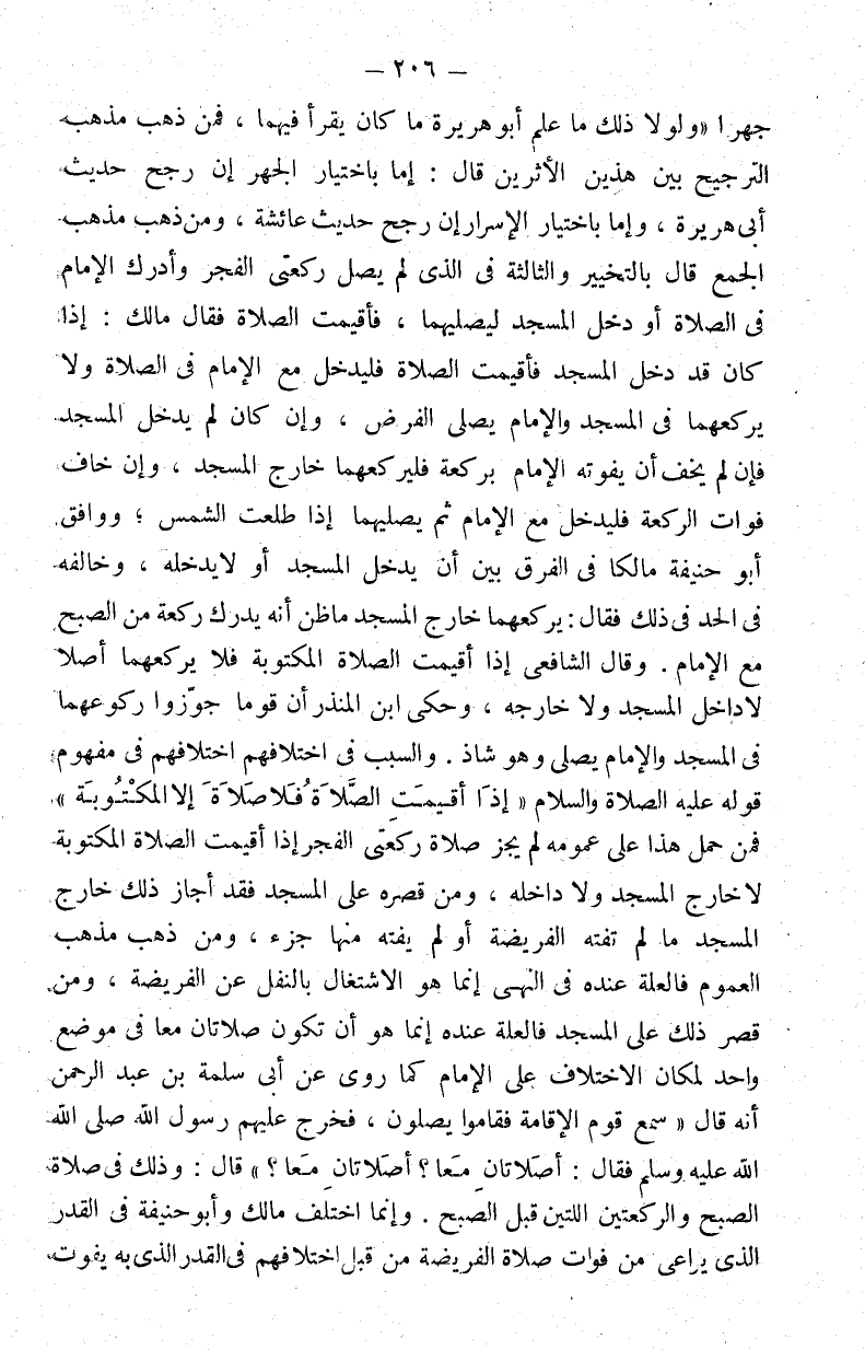 جهرا ولولا ذلك ما علم أبو هريرة ما كان يقرأ فيهما فمن ذهب مذهب الترجيح بين هذين الأثرين قال: إما باختيار الجهر إن رجح حديث أبي هريرة وإما باختيار الإسرار إن رجح حديث عائشة ومن ذهب مذهب ي الفجر وأدرك الإمام في الصلاة أو دخل المسجد ليصليهما فأقيمت الصلاة فقال مالك: إذا كان قد دخل المسجد فأقيمت الصلاة فليدخل مع الإمام في الصلاة ولا يركعهما في المسجد والإمام يصلي الفرض وإن كان لم يدخل المسجد فإن لم يخف أن يفوته الإمام بركعة فليركعهما خارج المسجد وإن خاف فوات الركعة فليدخل مع الإمام ثم يصليهما إذا طلعت الشمس ووافق أبو حنيفة مالكا في الفرق بين أن يدخل المسجد أو لا يدخله وخالفه في الحد في ذلك فقال: يركعهما خارج المسجد ما ظن أنه يدرك ركعة من الصبح مع الإمام وقال الشافعي إذا أقيمت الصلاة المكتوبة فلا يركعهما أصلا لا داخل المسجد ولا خارجه وحكى ابن المنذر أن قوما جوزوا ركوعهما في المسجد والإمام يصلي وهو شاذ. والسبب في اختلافهم اختلافهم في مفهوم قوله عليه الصلاة والسلام: "إذا أقيمت الصلاة فلا صلاة إلا المكتوبة" فمن حمل هذا على عمومه لم يجز صلاة ركعتي الفجر إذا أقيمت الصلاة المكتوبة لا خارج المسجد ولا داخله ومن قصره على المسجد فقد أجاز ذلك خارج المسجد ما لم تفته الفريضة أو لم يفته منها جزء ومن ذهب مذهب العموم فالعلة عنده في النهي إنما هو الاشتغال بالنفل عن الفريضة ومن قصر ذلك على المسجد فالعلة عنده إنما هو أن تكون صلاتان معا في موضع واحد لمكان الاختلاف على الإمام كما روي عن أبي سلمة بن عبد الرحمن أنه قال سمع قوم الإقامة فقاموا يصلون فخرج عليهم رسول الله صلى الله عليه وسلم فقال: "أصلاتان معا؟ أصلاتان معا؟" قال وذلك في صلاة الصبح والركعتين اللتين قبل الصبح. وإنما اختلف مالك وأبو حنيفة في القدر الذي يراعى من فوات صلاة الفريضة من قبل اختلافهم في القدر الذي يفوت