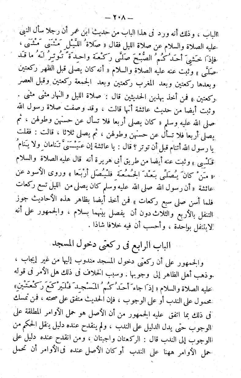الباب وذلك أنه ورد في هذا الباب من حديث ابن عمر أن رجلا سأل النبي عليه الصلاة والسلام عن صلاة الليل فقال: "صلاة الليل مثنى مثنى فإذا خشي أحدكم الصبح صلى ركعة واحدة توتر له ما قد صلى" وثبت عنه عليه الصلاة والسلام أنه كان يصلي قبل الظهر ركعتين وبعدها ركعتين وبعد المغرب ركعتين وبعد الجمعة ركعتين وقبل العصر ركعتين فمن أخذ بهذين الحديثين قال: صلاة الليل والنهار مثنى مثنى. وثبت أيضا من حديث عائشة أنها قالت: وقد وصفت صلاة رسول الله صلى الله عليه وسلم كان يصلي أربعا فلا تسأل عن حسنهن وطولهن ثم يصلي أربعا فلا تسأل عن حسنهن وطولهن ثم يصلي ثلاثا قالت: فقلت يا رسول الله أتنام قبل أن توتر؟ قال: "يا عائشة إن عيني تنامان ولا ينام قلبي" وثبت عنه أيضا من طريق أبي هريرة أنه قال عليه الصلاة والسلام: "من كان يصلي بعد الجمعة فليصل أربعا" وروى الأسود عن عائشة أن رسول الله صلى الله عليه وسلم كان يصلي من الليل تسع ركعات فلما أسن صلى سبع ركعات فمن أخد أيضا بظاهر هذه الأحاديث لصاحب التنفل بالأربع والثلاث دون أن يفصل بينها بسلام والجمهور على أنه لا يتنفل بواحدة وأحسب أن فيه خلافا شاذا.