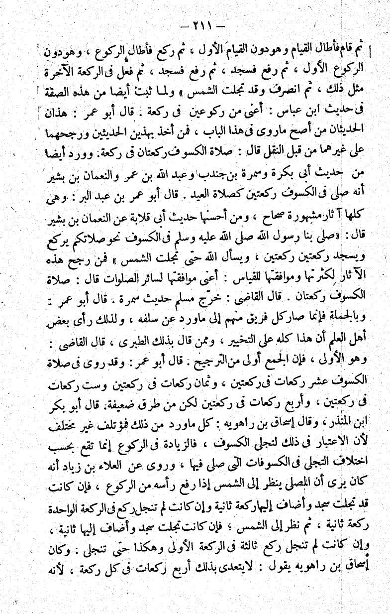 ثم قام فأطال القيام وهو دون القيام الأول ثم ركع فأطال الركوع وهو دون الركوع الأول ثم رفع فسجد ثم رفع فسجد ثم فعل في الركعة الآخرة مثل ذلك ثم انصرف وقد تجلت الشمس ولما ثبت أيضا من هذه الصفة في حديث ابن عباس أعني من ركوعين في ركعة. قال أبو عمر: هذان الحديثان من أصح ما روي في هذا الباب فمن أخذ بهذين قبل النقل قال: صلاة الكسوف ركعتان في ركعة. وورد أيضا من حديث أبي بكرة وسمرة بن جندب وعبد الله بن عمر والنعمان بن بشير أنه صلى في الكسوف ركعتين كصلاة العيد. قال أبو عمر بن عبد البر: وهي كلها آثار مشهورة صحاح ومن أحسنها حديث أبي قلابة عن النعمان بن بشير قال صلى بنا رسول الله صلى الله عليه وسلم في الكسوف نحو ويسجد ركعتين ركعتين ويسأل الله حتى تجلت الشمس فمن رجح هذه الآثار لكثرتها وموافقتها للقياس: أعني موافقتها لسائر الصلوات قال: صلاة الكسوف ركعتان: قال القاضي: خرج مسلم حديث سمرة. قال أبو عمر: وبالجملة فإنما صار كل فريق منهم إلى ما ورد عن سلفه ولذلك رأى بعض أهل العلم أن هذا كله على التخيير وممن قال بذلك الطبري قال القاضي: وهو الأولى فإن الجمع أولى من الترجيح. قال أبو عمر: وقد روي في صلاة الكسوف عشر ركعات في ركعتين وثمان ركعات في ركعتين وست ركعات في ركعتين وأربع ركعات في ركعتين لكن من طرق ضعيفة. قال أبو بكر بن المنذر وقال إسحاق بن راهويه: كل ما ورد من ذلك فمؤتلف غير مختلف لأن الاعتبار في ذلك لتجلي الكسوف فالزيادة في الركوع إنما تقع بحسب اختلاف التجلي في الكسوفات التي صلى فيها وروي عن العلاء بن زياد أنه كان يرى أن المصلي ينظر إلى الشمس إذا رفع رأسه من الركوع فإن كانت قد تجلت سجد وأضاف إليها ركعة ثانية وإن كانت لم تنجل ركع في الركعة الواحدة ركعة ثانية ثم نظر إلى الشمس فإن كانت تجلت سجد وأضاف إليها ثانية وإن كانت لم تنجل ركع ثالثة في الركعة الأولى وهكذا حتى تنجلي. وكان إسحاق بن راهويه يقول: لا يتعدى بذلك أربع ركعات في كل ركعة لأنه