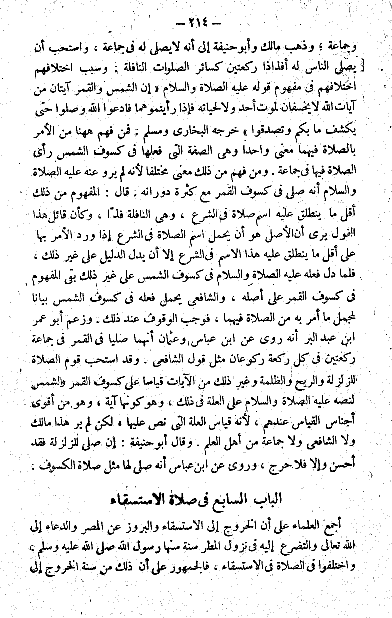 وجماعة وذهب مالك وأبو حنيفة إلى أنه لا يصلى له في جماعة واستحبوا أن يصلي الناس له أفذاذا ركعتين كسائر الصلوات النافلة. وسبب اختلافهم اختلافهم في مفهوم قوله عليه الصلاة والسلام: "إن الشمس والقمر آيتان من آيات الله لا يخسفان لموت أحد ولا لحياته فإذا رأيتموهما فادعوا الله وصلوا حتى يكشف ما بكم وتصدقوا" خرجه البخاري ومسلم. فمن فهم هاهنا من الأمر بالصلاة فيهما معنى واحدا وهي الصفة التي فعلها في كسوف الشمس رأى الصلاة فيها في جماعة. ومن فهم من ذلك معنى مختلفا لأنه لم يرو عنه عليه الصلاة والسلام أنه صلى في كسوف القمر مع كثرة دورانه. قال المفهوم من ذلك أقل ما ينطلق عليه اسم صلاة في الشرع وهي النافلة فذا وكأن قائل هذا القول يرى أن الأصل هو أن يحمل اسم الصلاة في الشرع إذا ورد الأمر بها على أقل ما ينطلق عليه هذا الاسم في الشرع إلا أن يدل الدليل على غير ذلك فلما دل فعله عليه الصلاة والسلام في كسوف الشمس على غير ذلك بقي المفهوم في كسوف القمر على أصله والشافعي يحمل فعله في كسوف الشمس بيانا لمجمل ما أمر به من الصلاة فيهما فوجب الوقوف عند ذلك. وزعم أبو عمر بن عبد البر أنه روي عن ابن عباس وعثمان أنهما صليا في القمر في جماعة ركعتين في كل ركعة ركوعان مثل قول الشافعي. وقد استحب قوم الصلاة للزلزلة والريح والظلمة وغير ذلك من الآيات قياسا على كسوف القمر والشمس لنصه عليه الصلاة والسلام على العلة في ذلك وهو كونها آية وهو من أقوى أجناس القياس عندهم لأنه قياس العلة التي نص عليها لكن لم ير هذا مالك ولا الشافعي ولا جماعة من أهل العلم. وقال أبو حنيفة: إن صلى للزلزلة فقد أحسن وإلا فلا حرج وروي عن ابن عباس أنه صلى لها مثل صلاة الكسوف.