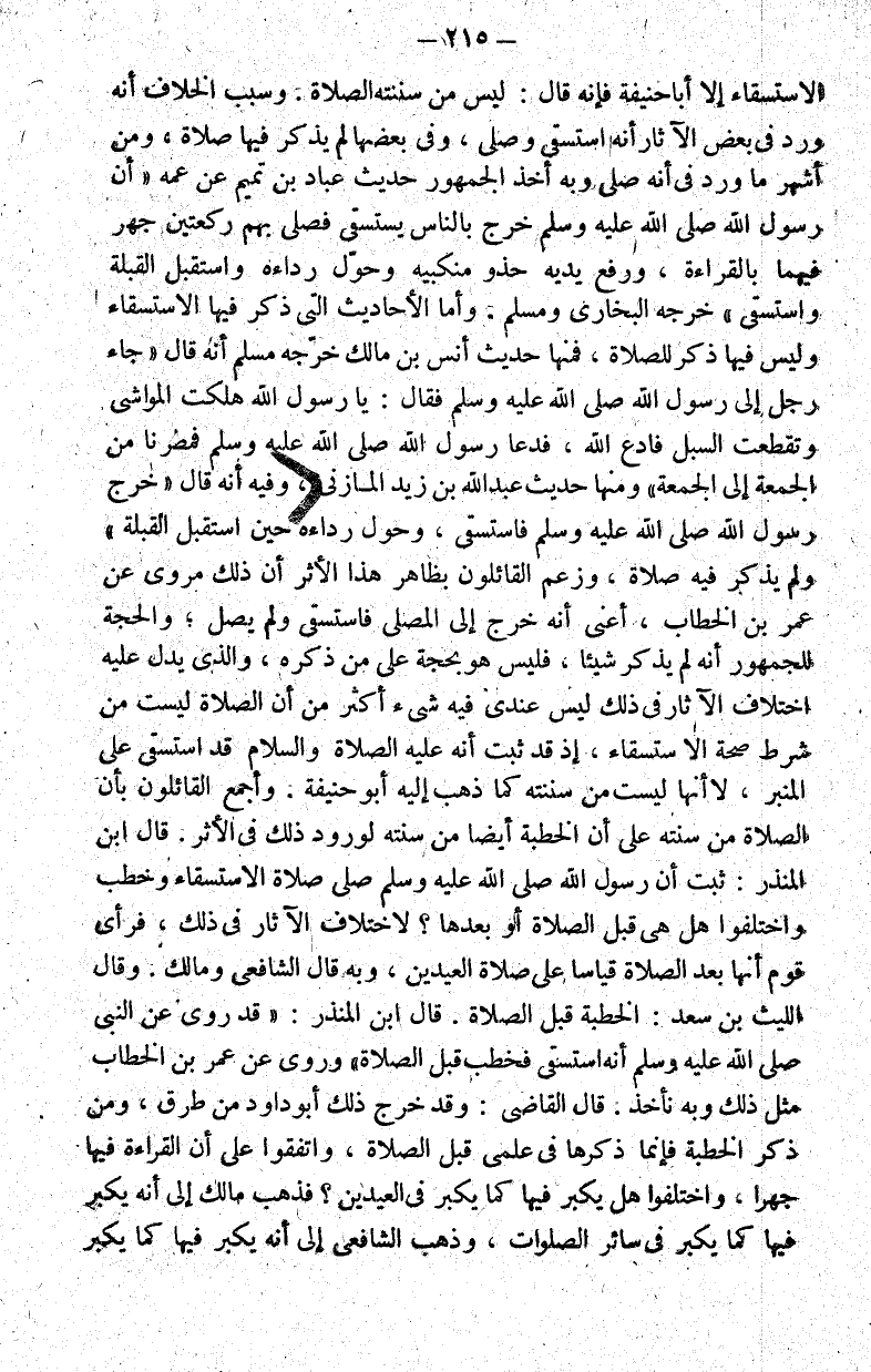 الاستسقاء إلا أبا حنيفة فإنه قال: ليس من سنة الصلاة. وسبب الخلاف أنه ورد في بعض الآثار أنه استسقى وصلى وفي بعضها لم يذكر فيها صلاة ومن أشهر ما ورد في أنه صلى وبه أخذ الجمهور حديث عباد بن تميم عن عمه أن رسول الله صلى الله عليه وسلم خرج بالناس يستسقي فصلى بهم ركعتين الرجعة فيهما بالقراءة ورفع يديه حذو منكبيه وحول رداءه واستقبل القبلة واستسقى خرجه البخاري ومسلم. وأما الأحاديث التي ذكر فيها الاستسقاء وليس فيها ذكر للصلاة فمنها حديث أنس ابن مالك خرجه مسلم أنه قال جاء رجل إلى رسول الله صلى الله عليه وسلم فقال يا رسول الله هلكت المواشي وانقطعت السبل فادع الله فدعا رسول الله صلى الله عليه وسلم فمطرنا من الجمعة إلى الجمعة ومنها حديث عبد الله بن زيد المازني وفيه أنه قال خرج رسول الله صلى الله عليه وسلم فاستسقى وحول رداءه حين استقبل القبلة ولم يذكر فيه صلاة وزعم القائلون بظاهر هذا الأثر أن ذلك مروي عن عمر بن الخطاب أعني أنه خرج إلى المصلى فاستسقى ولم يصل والحجة للجمهور أنه من لم يذكر شيئا فليس هو بحجة على من ذكره والذي يدل عليه اختلاف الآثار في ذلك ليس عندي فيه شيء أكثر من أن الصلاة ليست من شرط صحة الاستسقاء إذ قد ثبت أنه عليه الصلاة والسلام قد استسقى على المنبر لا أنها ليست من سننه كما ذهب إليه أبو حنيفة. وأجمع القائلون بأن الصلاة من سننه على أن الخطبة أيضا من سننه لورود ذلك في الأثر. قال ابن المنذر: ثبت أن رسول الله صلى الله عليه وسلم صلى صلاة الاستسقاء وخطب واختلفوا هل هي قبل الصلاة أو بعدها؟ لاختلاف الآثار في ذلك فرأى قوم أنها بعد الصلاة قياسا على صلاة العيدين وبه قال الشافعي ومالك. وقال الليث بن سعد: الخطبة قبل الصلاة. قال ابن المنذر: قد روي عن النبي صلى الله عليه وسلم أنه استسقى فخطب قبل الصلاة وروي عن عمر بن الخطاب مثل ذلك وبه نأخذ. قال القاضي: وقد خرج ذلك أبو داود من طرق ومن ذكر الخطبة فإنما ذكرها في علمي قبل الصلاة واتفقوا على أن القراءة فيها جهرا واختلفوا هل يكبر فيها كما يكبر في العيدين؟ فذهب مالك إلى أنه يكبر فيها كما يكبر في سائر الصلوات وذهب الشافعي إلى أنه يكبر فيها كما يكبر