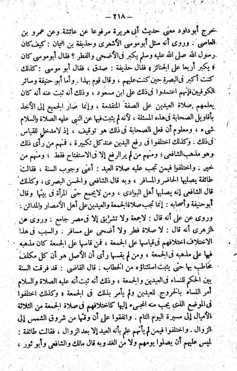 خرج أبو داود معنى حديث أبي هريرة مرفوعا عن عائشة وعن عمرو بن العاص. وروي أنه سئل أبو موسى الأشعري وحذيفة بن اليمان: كيف كان رسول الله صلى الله عليه وسلم يكبر في الأضحى والفطر؟ فقال أبو موسى كان يكبر أربعا على الجنائز فقال حذيفة: صدق فقال أبو موسى: كذلك كنت أكبر في البصرة حين كنت عليهم وقال قوم بهذا. وأما أبو حنيفة وسائر الكوفيين فإنهم اعتمدوا في ذلك على ابن مسعود وذلك أنه ثبت عنه أنه كان يعلمهم صلاة العيدين على وإنما صار الجميع إلى الأخذ بأقاويل الصحابة في هذه المسألة لأنه لم يثبت فيها عن النبي عليه الصلاة والسلام شيء ومعلوم أن فعل الصحابة في ذلك هو توقيف إذ لا مدخل للقياس في ذلك. وكذلك اختلفوا في رفع اليدين عند كل تكبيرة فمنهم من رأى ذلك وهو مذهب الشافعي ومنهم من لم ير الرفع إلا في الاستفتاح فقط ومنهم من خير واختلفوا فيمن تجب عليه صلاة العيد: أعني وجوب السنة فقالت طائفة يصليها الحاضر والمسافر وبه قال الشافعي والحسن البصري وكذلك قال الشافعي إنه يصليها أهل البوادي ومن لا يجمع حتى المرأة في بيتها وقال أبو حنيفة وأصحابه: إنما تجب صلاة الجمعة والعيدين على أهل الأمصار والمدائن. وروي عن علي أنه قال: لا جمعة ولا تشريق إلا في مصر جامع. وروي عن الزهري أنه قال: لا صلاة فطر ولا أضحى على مسافر. والسبب في هذا الاختلاف اختلافهم في قياسها على الجمعة فمن قاسها على الجمعة كان مذهبه فيها على مذهبه في الجمعة ومن لم يقسها رأى أن الأصل هو أن كل مكلف مخاطب بها حتى يثبت استثناؤه من الخطاب. قال القاضي: قد فرقت السنة بين الحكم للنساء في العيدين والجمعة وذلك أنه ثبت أنه عليه الصلاة والسلام أمر النساء بالخروج للعيدين ولم يأمر بذلك في الجمعة وكذلك اختلفوا في الموضع الذي يجب منه المجيء إليها كاختلافهم في صلاة الجمعة من الثلاثة الأميال إلى مسيرة اليوم التام. واتفقوا على أن وقتها من شروق الشمس إلى الزوال. واختلفوا فيمن لم يأتهم علم بأنه العيد إلا بعد الزوال فقالت طائفة: ليس عليهم أن يصلوا يومهم ولا من الغد وبه قال مالك والشافعي وأبو ثور,
