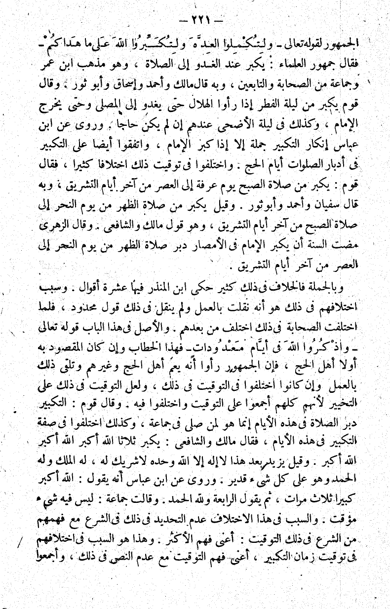 وبالجملة فالخلاف في ذلك كثير حكى ابن المنذر فيها عشرة أقوال. وسبب اختلافهم في ذلك هو أنه نقلت ومعناه ولم ينقل في ذلك قول محدود فلما اختلفت الصحابة في ذلك اختلف من بعدهم. والأصل في هذا الباب قوله تعالى: {وَاذْكُرُوا اللَّهَ فِي أَيَّامٍ مَعْدُودَاتٍ} فهذا الخطاب وإن كان المقصود به أولا أهل الحج فإن الجمهور رأوا أنه يعم أهل الحج وغيرهم وتلقي ذلك ومعناه وإن كانوا اختلفوا في التوقيت في ذلك ولعل التوقيت في ذلك على التخيير لأنهم كلهم أجمعوا على التوقيت واختلفوا فيه. وقال قوم: التكبير دبر الصلاة في هذه الأيام إنما هو لمن صلى في جماعة وكذلك اختلفوا في صفة التكبير في هذه الأيام فقال مالك والشافعي: يكبر ثلاثا الله أكبر الله أكبر الله أكبر. وقيل يزيد بعد هذا لا إله إلا الله وحده لا شريك له له الملك وله الحمد وهو على كل شيء قدير. وروي عن ابن عباس أنه يقول: الله أكبر كبيرا ثلاث مرات ثم يقول الرابعة ولله الحمد. وقال جماعة: ليس فيه شيء مؤقت. والسبب في هذا الاختلاف عدم التحديد في ذلك في الشرع مع فهمهم من الشرع في ذلك التوقيت: أعني فهم الأكثر. وهذا هو السبب في اختلافهم في توقيت زمان التكبير أعني فهم التوقيت مع عدم النص في ذلك وأجمعوا