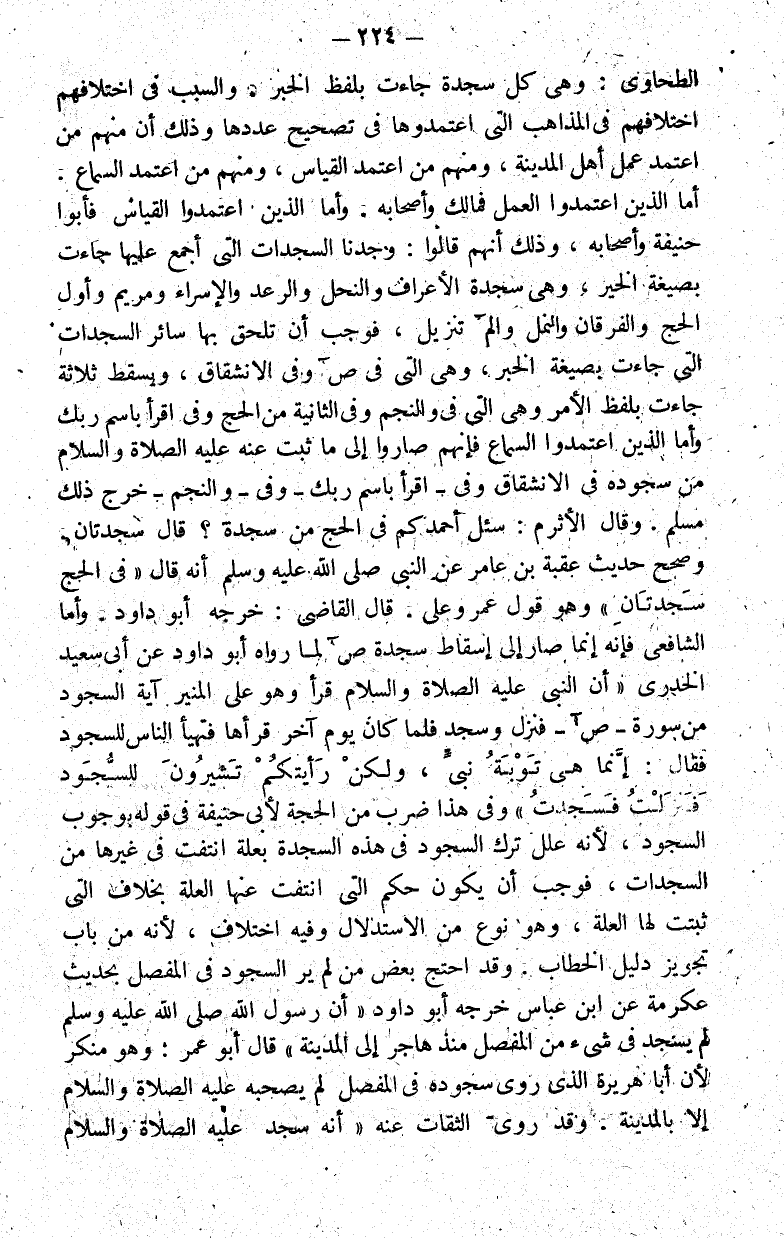 الطحاوي: وهي كل سجدة جاءت بلفظ الخبر. والسبب في اختلافهم اختلافهم في إذنه التي اعتمدوها في تصحيح عددها وذلك أن منهم من اعتمد عمل أهل المدينة ومنهم من اعتمد القياس ومنهم من اعتمد السماع. أما الذين اعتمدوا العمل فمالك وأصحابه. وأما الذين اعتمدوا القياس فأبو حنيفة وأصحابه وذلك أنهم قالوا: وجدنا السجدات التي أجمع عليها جاءت بصيغة الخبر وهي سجدة الأعراف والنحل والرعد والإسراء ومريم وأول الحج والفرقان والنمل و آلم تنزيل فوجب أن يلحق بها سائر السجدات التي جاءت بصيغة الخبر وهي التي في ص والانشقاق لبعض ثلاث جاءت بلفظ الأمر وهي التي في والنجم وفي الثانية من الحج وفي اقرأ باسم ربك وأما الذين اعتمدوا السماع فإنهم صاروا إلى ما ثبت عنه عليه الصلاة والسلام من سجوده في الانشقاق وفي {اقْرَأْ بِاسْمِ رَبِّكَ} وفي {وَالنَّجْمِ} خرج ذلك مسلم. وقال الأثرم: سئل لأحمدكم في الحج من سجدة؟ قال سجدتان وصحح حديث عقبة بن عامر عن النبي صلى الله عليه وسلم أنه قال في الحج سجدتان وهو قول عمر وعلي. قال القاضي: خرجه أبو داود. وأما الشافعي فإنه إنما صار إلى إسقاط سجدة ص لما رواه أبو داود عن أبي سعيد الخدري أن النبي عليه الصلاة والسلام قرأ وهو على المنبر آية السجود من سورة {ص} فنزل وسجد فلما كان يوم آخر قرأها فتهيأ الناس للسجود فقال: "إنما هي توبة نبي ولكن رأيتكم تشيرون للسجود فنزلت فسجدت" وفي هذا ضرب من الحجة لأبي حنيفة في قوله بوجوب السجود لأنه علل ترك السجود في هذه السجدة بعلة انتفت في غيرها من السجدات فوجب أن يكون حكم التي انتفت عنها العلة بخلاف التي ثبتت لها العلة وهو نوع من الاستدلال وفيه اختلاف لأنه من باب تجويز دليل الخطاب. وقد احتج بعض من لم ير السجود في المفصل بحديث عكرمة عن ابن عباس خرجه أبو داود أن رسول الله صلى الله عليه وسلم لم يسجد في شيء من المفصل منذ هاجر إلى المدينة قال أبو عمر: وهو منكر لأن أبا هريرة الذي روى سجوده في المفصل لم يصحبه عليه الصلاة والسلام إلا بالمدينة. وقد روى الثقات عنه أنه سجد عليه الصلاة والسلام