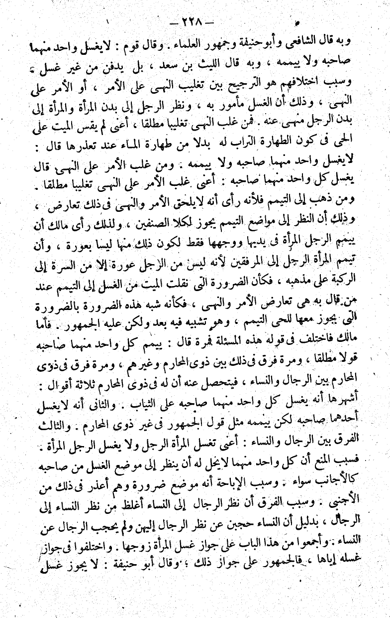 وبه قال الشافعي وأبو حنيفة وجمهور العلماء وقال قوم: لا يغسل واحد منهما صاحبه ولا ييممه وبه قال الليث بن سعد بل يدفن من غير غسل. وسبب اختلافهم هو الترجيح بين تغليب النهي على الأمر أو الأمر على النهي وذلك أن الغسل مأمور به ونظر الرجل إلى بدن المرأة والمرأة إلى بدن الرجل منهي عنه. فمن غلب النهي تغليبا مطلقا أعني لم يقس الميت على الحي في كون الطهارة التراب له بدلا من طهارة الماء عند تعذرها قال: لا يغسل كل واحد منهما صاحبه ولا ييممه. ومن غلب الأمر على النهي قال يغسل كل واحد منهما صاحبه: أعني غلب الأمر على النهي تغليبا مطلقا. ومن ذهب إلى التيمم فلأنه رأى أنه لا يلحق الأمر والنهي في ذلك تعارض وذلك أن النظر إلى مواضع التيمم يجوز لكلا الصنفين ولذلك رأى مالك أن ييمم الرجل المرأة في يديها ووجهها فقط لكون ذلك منها ليسا بعورة وأن تيمم المرأة الرجل إلى المرفقين لأنه ليس من الرجل عورة إلا من السرة إلى الركبة على مذهبه فكأن الضرورة التي نقلت الميت من الغسل إلى التيمم عند من قال به هي تعارض الأمر والنهي فكأنه شبه هذه الضرورة بالضرورة التي يجوز معها للحي التيمم, وهو تسبيه فيه بعد ولكن عليه الجمهور. فأما مالك فاختلف في قوله هذه المسألة فمرة قال: ييمم كل واحد منهما صاحبه قولا مطلقا ومرة فرق في ذلك بين ذوي المحارم وغيرهم ومرة فرق في ذوي المحارم بين الرجال والنساء فيتحصل عنه أن له في ذوي المحارم ثلاثة أقوال: أشهرها أنه يغسل كل واحد منهما صاحبه على الثياب. والثاني أنه لا يغسل أحدهما صاحبه ولكن ييممه مثل قول الجمهور في غير ذوي المحارم. والثالث الفرق بين الرجال والنساء: أعني تغسل المرأة الرجل ولا يغسل الرجل المرأة. فسبب المنع أن كل واحد منهما لا يحل له أن ينظر إلى موضع الغسل من صاحبه كالأجانب سواء. وسبب الإباحة أنه موضع ضرورة وهم أعذر في ذلك من الأجنبي. وسبب الفرق أن نظر الرجال إلى النساء أغلظ من نظر النساء إلى الرجال بدليل أن النساء حجبن عن نظر الرجال إليهن ولم يحجب الرجال عن النساء. وأجمعوا من هذا الباب على جواز غسل المرأة زوجها. واختلفوا في جواز غسله إياها فالجمهور على جواز ذلك وقال أبو حنيفة: لا يجوز غسل