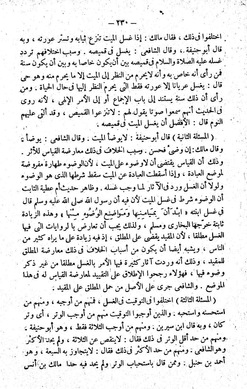 المسألة الثانية : قال أبو حنيفة: لا يوضأ الميت. وقال الشافعي: يوضأ. وقال مالك: إن وضئ فحسن. وسبب الخلاف في ذلك معارضة القياس للأثر. وذلك أن القياس يقتضي أن لا وضوء على الميت لأن الوضوء طهارة مفروضة لموضع العبادة وإذا أسقطت العبادة عن الميت سقط شرطها الذي هو الوضوء ولولا أن الغسل ورد في الآثار لما وجب غسله. وظاهر حديث أم عطية الثابت أن الوضوء شرط في غسل الميت لأن فيه أن رسول الله صلى الله عليه وسلم قال في غسل ابنته: "ابدأن بميامنها ومواضع الوضوء منها" وهذه الزيادة ثابتة خرجها البخاري ومسلم. ولذلك يجب أن تعارض بالروايات التي فيها الغسل مطلقا لأن المقيد يقضي على المطلق إذ فيه زيادة على ما يراه كثير من الناس ويشبه أيضا أن يكون الخلاف في ذلك معارضة المطلق للمقيد وذلك أنه وردت آثار كثيرة فيها الأمر بالغسل مطلقا من غير ذكر وضوء فيها فهؤلاء رجحوا الإطلاق على التقييد لمعارضة القياس له في هذا الموضع. و الشافعي جرى على الأصل من حمل المطلق على المقيد.