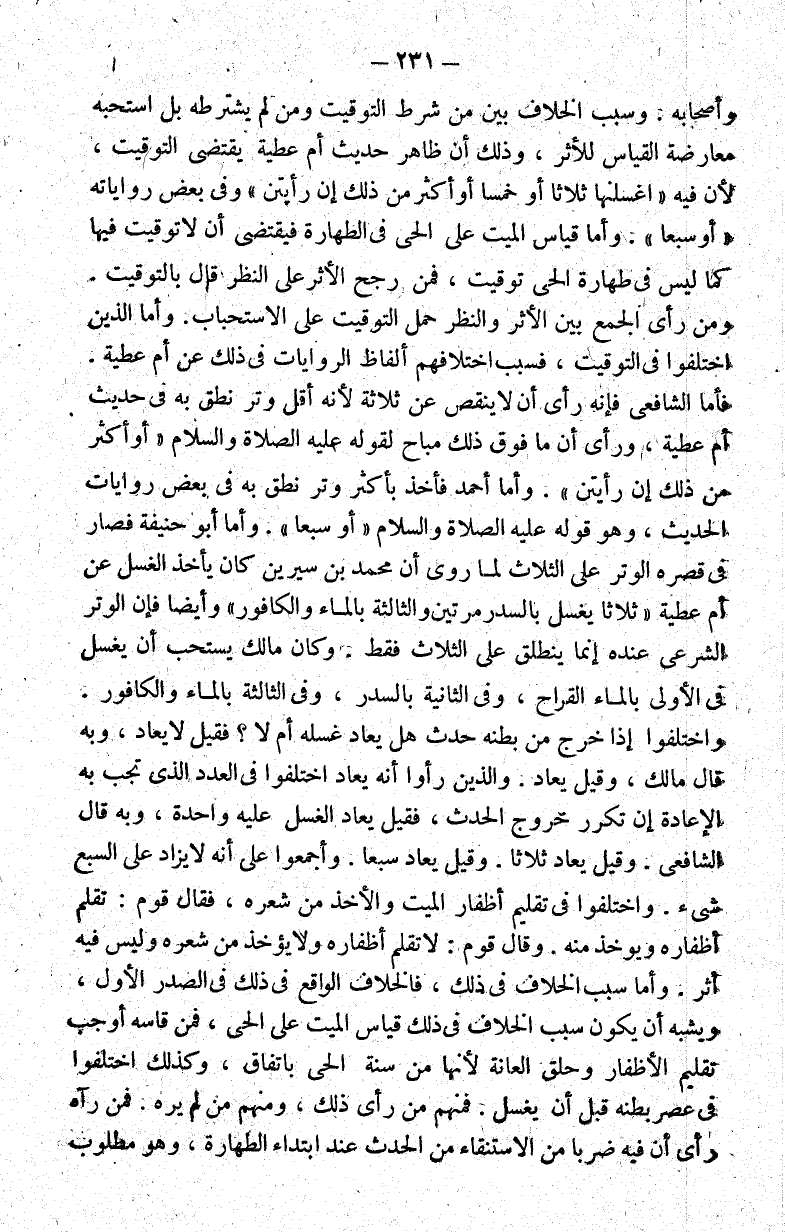 وأصحابه. وسبب الخلاف بين من شرط التوقيت ومن لم يشترطه بل استحبه معارضة القياس للأثر وذلك أن ظاهر حديث أم عطية يقتضي التوقيت لأن فيه اغسلنها ثلاثا أو خمسا أو أكثر من ذلك إن رأيتن وفي بعض رواياته أو سبعا. وأما قياس الميت على الحي في الطهارة فيقتضي أن لا توقيت فيها كما ليس في طهارة الحي توقيت فمن رجح الأثر على النظر قال بالتوقيت. ومن رأى الجمع بين الأثر والنظر حمل التوقيت على الاستحباب. وأما الذين اختلفوا في التوقيت فسبب اختلافهم اختلاف ألفاظ الروايات في ذلك عن أم عطية. فأما الشافعي فإنه رأى أن لا ينقص عن ثلاثة لأنه أقل وتر نطق به في حديث أم عطية ورأى أن ما فوق ذلك مباح لقوله عليه الصلاة والسلام: "أو أكثر من ذلك إن رأيتن" . وأما أحمد فأخذ بأكثر وتر نطق به في بعض روايات الحديث وهو قوله عليه الصلاة والسلام: "أو سبعا" . وأما أبو حنيفة فصار في قصره الوتر على الثلاث لما روي أن محمد بن سيرين كان يأخذ الغسل عن أم عطية ثلاثا يغسل بالسدر مرتين والثالثة بالماء والكافور وأيضا فإن الوتر الشرعي عنده إنما ينطلق على الثلاث فقط. وكان مالك يستحب أن يغسل في الأولى بالماء القراح وفي الثانية بالسدر وفي الثالثة بالماء والكافور. واختلفوا إذا خرج من بطنه حدث هل يعاد غسله أم لا؟ فقيل لا يعاد وبه قال مالك وقيل يعاد والذين رأوا أنه يعاد اختلفوا في العدد الذي تجب به الإعادة إن تكرر خروج الحدث فقيل يعاد الغسل عليه واحدة وبه قال الشافعي. وقيل يعاد ثلاثا. وقيل يعاد سبعا. وأجمعوا على أنه لا يزاد على السبع شيء. واختلفوا في تقليم أظفار الميت والأخذ من شعره فقال قوم: تقلم أظفاره ويؤخذ منه. وقال قوم: لا تقلم أظفاره ولا يؤخذ من شعره وليس فيه أثر. وأما سبب الخلاف في ذلك فالخلاف الواقع في ذلك في الصدر الأول ويشبه أن يكون سبب الخلاف في ذلك قياس الميت على الحي فمن قاسه أوجب تقليم الأظفار وحلق العانة لأنها من سنة الحي باتفاق وكذلك اختلفوا في عصر بطنه قبل أن يغسل. فمنهم من رأى ذلك ومنهم من لم يره. فمن رآه رأى أن فيه ضربا من الاستنقاء من الحدث عند ابتداء الطهارة وهو مطلوب