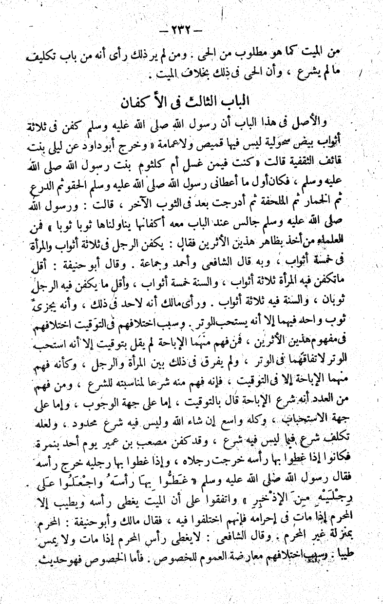 والأصل في هذا الباب أن رسول الله صلى الله عليه وسلم كفن في ثلاثة أثواب بيض سحولية ليس فيها قميص ولا عمامة وخرج أبو داود عن ليلى بنت قائف الثقفية قالت كنت فيمن غسل أم كلثوم بنت رسول الله صلى الله عليه وسلم فكان أول ما أعطاني رسول الله صلى الله عليه وسلم الحقو ثم الدرع ثم الخمار ثم الملحفة ثم أدرجت بعد في الثوب الآخر قالت: ورسول الله صلى الله عليه وسلم جالس عند الباب معه أكفانها يناولناها ثوبا ثوبا فمن العلماء من أخذ بظاهر هذين الأثرين فقال: يكفن الرجل في ثلاثة أثواب والمرأة في خمسة أثواب, وبه قال الشافعي وأحمد وجماعة. وقال أبو حنيفة: أقل ما تكفن فيه المرأة ثلاثة أثواب والسنة خمسة أثواب وأقل ما يكفن فيه الرجل ثوبان والسنة فيه ثلاثة أثواب. ورأى مالك أنه لا حد في ذلك وأنه يجزئ ثوب واحد فيهما إلا أنه يستحب الوتر. وسبب اختلافهم في التوقيت اختلافهم في مفهوم هذين الأثرين فمن فهم منهما الإباحة لم يقل بتوقيت إلا أنه استحب الوتر لاتفاقهما في الوتر ولم يفرق في ذلك بين المرأة والرجل وكأنه فهم منهما الإباحة إلا في التوقيت فإنه فهم منه شرعا لمناسبته للشرع ومن فهم من العدو أنه شرع لا إباحة قال بالتوقيت إما على جهة الوجوب وإما على جهة الاستحباب وكله واسع إن شاء الله وليس فيه شرع محدود ولعله تكلف شرع فيما ليس فيه شرع وقد كفن مصعب بن عمير يوم أحد بنمرة فكانوا إذا غطوا بها رأسه خرجت رجلاه وإذا غطوا بها رجليه خرج رأسه فقال رسول الله صلى الله عليه وسلم: "غطوا بها رأسه واجعلوا على رجليه من الإذخر" واتفقوا على أن الميت يغطى رأسه ويطيب إلا المحرم إذا مات في إحرامه فإنهم اختلفوا فيه فقال مالك وأبو حنيفة: المحرم بمنزلة غير المحرم. وقال الشافعي: لا يغطى رأس المحرم إذا مات ولا يمس طيبا. وسبب اختلافهم معارضة العموم للخصوص. فأما الخصوص فهو حديث
