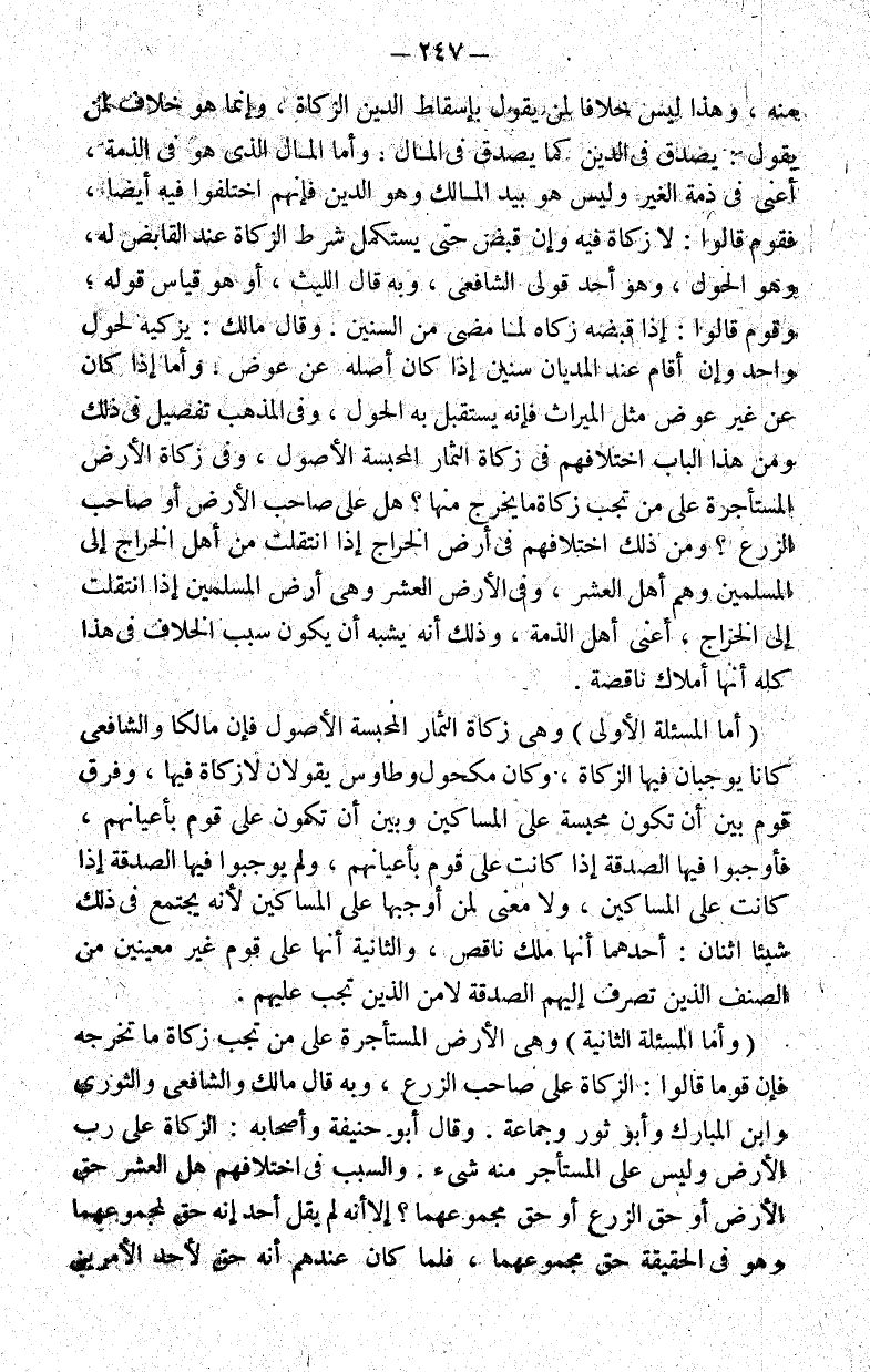 منه وهذا ليس خلافا لمن يقول بإسقاط الدين الزكاة وإنما هو خلاف لمن يقول: يصدق في الدين كما يصدق في المال. وأما المال الذي هو في الذمة أعني في ذمة الغير وليس هو بيد المالك وهو الدين فإنهم اختلفوا فيه أيضا فقوم قالوا: لا زكاة فيه وإن قبض حتى يستكمل شرط الزكاة عند القابض له وهو الحول وهو أحد قولي الشافعي وبه قال الليث أو هو قياس قوله وقوم قالوا: إذا قبضه زكاه لما مضى من السنين. وقال مالك: يزكيه لحول واحد وإن قام عند المديان سنين إذا كان أصله عن عوض. وأما إذا كان عن غير عوض مثل الميراث فإنه يستقبل به الحول وفي المذهب تفصيل في ذلك ومن هذا الباب اختلافهم في زكاة الثمار المحبسة الأصول وفي زكاة الأرض المستأجرة على من تجب زكاة ما يخرج منها؟ هل على صاحب الأرض أو صاحب الزرع؟ ومن ذلك اختلافهم في أرض الخراج إذا انتقلت من أهل الخراج إلى المسلمين وهم أهل العشر وفي الأرض العشر وهي أرض المسلمين إذا انتقلت إلى الخراج أعني أهل الذمة وذلك أنه يشبه أن يكون سبب الخلاف في هذا كله أنها أملاك ناقصة.