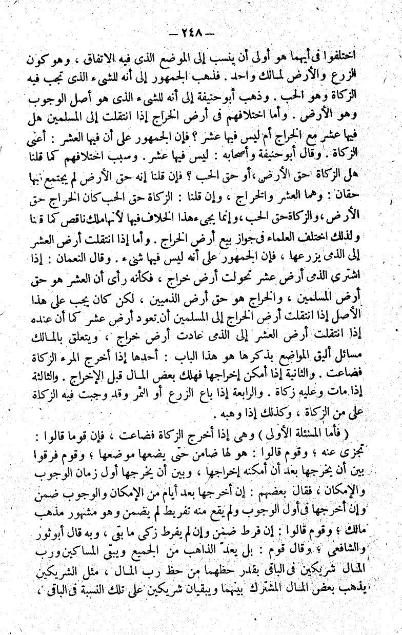 اختلفوا في أيهما هو أولى أن ينسب إلى الموضع الذي فيه الاتفاق وهو كون الزرع والأرض لمالك واحد. فذهب الجمهور إلى أنه للشيء الذي تجب فيه الزكاة وهو الحب. وذهب أبو حنيفة إلى أنه للشيء الذي هو أصل الوجوب وهو الأرض. وأما اختلافهم في أرض الخراج إذا انتقلت إلى المسلمين هل فيها عشر من الخراج أم ليس فيها عشر؟ فإن الجمهور على أن فيها العشر: أعني الزكاة. وقال أبو حنيفة وأصحابه: ليس فيها عشر. وسبب اختلافهم كما قلنا هل الزكاة حق الأرض أو حق الحب؟ فإن قلنا إنه حق الأرض لم يجتمع فيها حقان: وهما العشر والخراج وإن قلنا: الزكاة حق الحب كان الخراج حق الأرض والزكاة حق الحب وإنما يجيء هذا الخلاف فيها لأنها ملك ناقص كما قلنا ولذلك اختلف العلماء في جواز بيع أرض الخراج. وأما إذا انتقلت أرض العشر إلى الذمي يزرعها فإن الجمهور على أنه ليس فيها شيء. وقال النعمان: إذا اشترى الذمي أرض عشر تحولت أرض خراج فكأنه رأى أن العشر هو حق أرض المسلمين والخراج هو حق أرض الذميين لكن كان يجب على هذا الأصل إذا انتقلت أرض الخراج إلى المسلمين أن فإذا أرض عشر كما أن عنده إذا انتقلت أرض العشر إلى الذمي عادت أرض خراج ويتعلق بالمالك مسائل أليق المواضع بذكرها هو هذا الباب. أحدها إذا أخرج المرء الزكاة فضاعت. والثانية إذا أمكن إخراجها فهلك بعض المال قبل الإخراج. والثالثة إذا مات وعليه زكاة. والرابعة إذا باع الزرع أو الثمر وقد وجبت فيه الزكاة على من الزكاة وكذلك إذا وهبه.