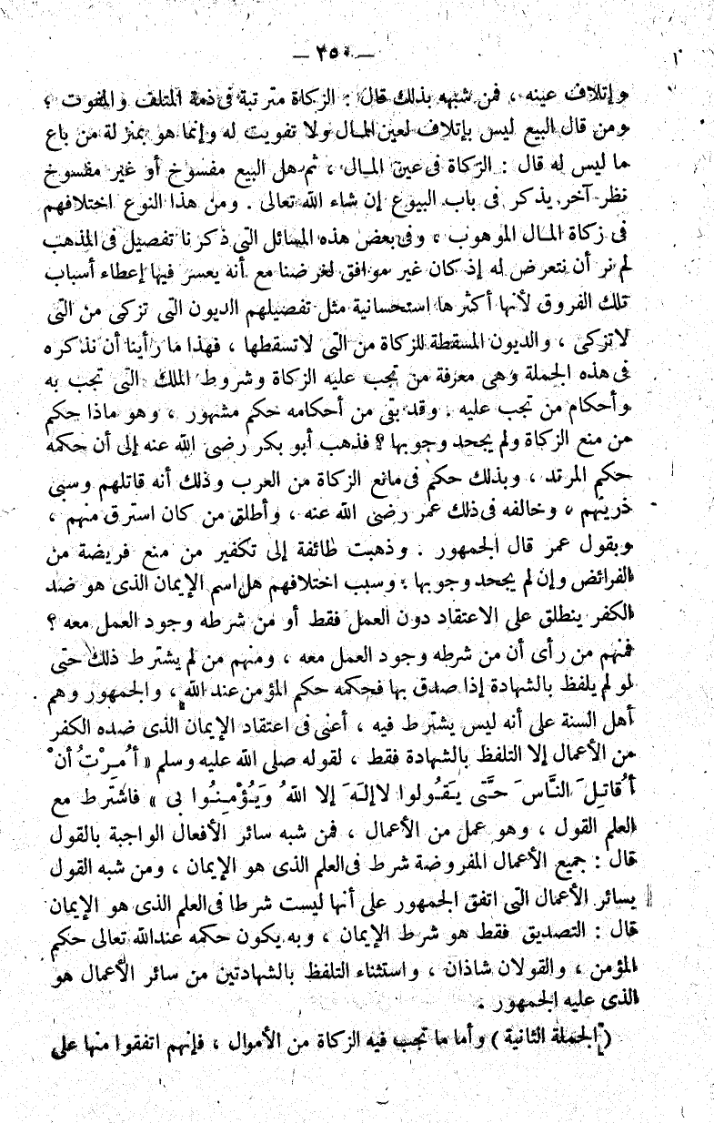 وإتلاف عينه فمن شبهه بذلك قال: الزكاة مترتبة في ذمة المتلف والمفوت ومن قال البيع ليس بإتلاف لعين المال ولا تفويت له وإنما هو بمنزلة من باع ما ليس له قال: الزكاة في عين المال ثم هل البيع مفسوخ أو غير مفسوخ نظر آخر يذكر في باب البيوع إن شاء الله تعالى. ومن هذا النوع اختلافهم في زكاة المال الموهوب وفي بعض هذه المسائل التي ذكرنا تفصيل في المذهب لم نر أن نتعرض له إذ كان غير موافق لغرضنا مع أنه يسر فيها تلك الفروق لأنها أكثرها استحسانية مثل تفصيلهم الديون التي تزكى من التي لا تزكى والديون المسقطة للزكاة من التي لا تسقطها فهذا ما رأينا أن نذكره في هذه الجملة وهي معرفة من تجب عليه الزكاة وشروط الملك التي تجب به وأحكام من تجب عليه. وقد بقي من أحكامه حكم مشهور وهو ماذا حكم من منع الزكاة ولم يجحد وجوبها؟ فذهب أبو بكر رضي الله عنه إلى أن حكمه حكم المرتد وبذلك حكم في مانع الزكاة من العرب وذلك أنه قاتلهم وسبى ذريتهم وخالفه في ذلك عمر رضي الله عنه وأطلق من كان استرق منهم وبقول عمر قال الجمهور. وذهبت طائفة إلى تكفير من منع فريضة من الفرائض وإن لم يجحد وجوبها. وسبب اختلافهم هل اسم الإيمان الذي هو ضد الكفر ينطلق على الاعتقاد دون العمل فقط أو من شرطه وجود العمل معه؟ فمنهم من رأى أن من شرطه وجود العمل معه ومنهم من لم يشترط ذلك حتى لو لم يلفظ بالشهادة إذا صدق بها فحكمه حكم المؤمن عند الله والجمهور وهم أهل السنة على أنه ليس يشترط فيه أعني في اعتقاد الإيمان الذي ضده الكفر من الأعمال إلا التلفظ بالشهادة فقط لقوله صلى الله عليه وسلم: "أمرت أن أقاتل الناس حتى يقولوا لا إله إلا الله ويؤمنوا بي" فاشترط مع العلم القول وهو عمل من الأعمال فمن شبه سائر الأفعال الواجبة بالقول قال: جميع الأعمال المفروضة شرط في العلم الذي هو الإيمان ومن شبه القول بسائر الأعمال التي اتفق الجمهور على أنها ليست شرطا في العلم الذي هو الإيمان قال: التصديق فقط هو شرط الإيمان وبه يكون حكمه عند الله تعالى حكم المؤمن والقولان شاذان واستثناء التلفظ بالشهادتين من سائر الأعمال هو الذي عليه الجمهور.