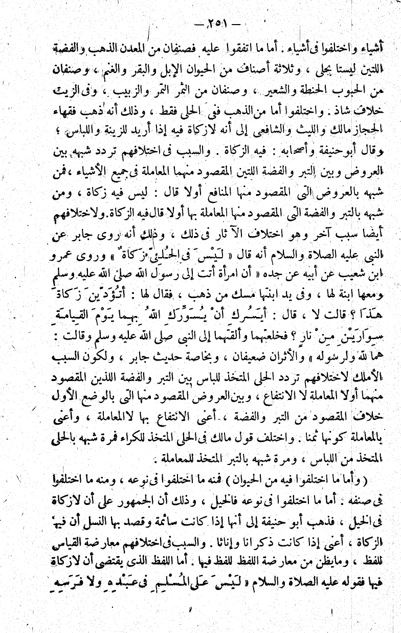أشياء واختلفوا في أشياء. أما ما اتفقوا عليه فصنفان من المعدن الذهب والفضة اللتين ليستا بحلي وثلاثة أصناف من الحيوان الإبل والبقر والغنم وصنفان من الحبوب الحنطة والشعير وصنفان من الثمر التمر والزبيب وفي الزيت خلاف شاذ. والذي اختلفوا فيه من الذهب هو الحلي فقط وذلك أنه ذهب فقهاء الحجاز مالك والليث والشافعي إلى أنه لا زكاة فيه إذا أريد للزينة واللباس وقال أبو حنيفة وأصحابه: فيه الزكاة. والسبب في اختلافهم تردد شبه بين العروض وبين التبر والفضة اللتين المقصود منهما المعاملة في جميع الأشياء شبهه بالتبر والفضة فمن شبهه بالعروض التي المقصود منها المنافع أولا قال: ليس فيه زكاة ومن شبهه بالتبر والفضة التي المقصود فيها المعاملة بها أولا قال فيه الزكاة. ولاختلافهم أيضا سبب آخر وهو اختلاف الآثار في ذلك. وذلك أنه روى جابر عن النبي عليه الصلاة والسلام أنه قال: "ليس في الحلي زكاة" وروى عمرو بن شعيب عن أبيه عن جده أن امرأة أتت إلى رسول الله صلى الله عليه وسلم ومعها ابنة لها وفي يد ابنتها مسك من ذهب فقال لها: "أتؤدين زكاة هذا؟" قالت لا قال: "أيسرك أن يسورك الله بهما يوم القيامة سوارين من نار؟" فخلعتهما وألقتهما إلى النبي صلى الله عليه وسلم وقالت: هما لله ولرسوله. والأثران ضعيفان وبخاصة حديث جابر ولكون السبب الأملك لاختلافهم تردد الحلي المتخذ للباس بين التبر والفضة اللذين المقصود منهما أولا المعاملة لا الانتفاع وبين العروض المقصود منها التي بالوضع الأول خلاف المقصود من التبر والفضة أعني الانتفاع بها لا المعاملة وأعني بالمعاملة كونها ثمنا واختلف قول مالك في الحلي المتخذ للكراء فمرة شبهه بالحلي المتخذ من اللباس ومرة شبهه بالتبر المتخذ للمعاملة.