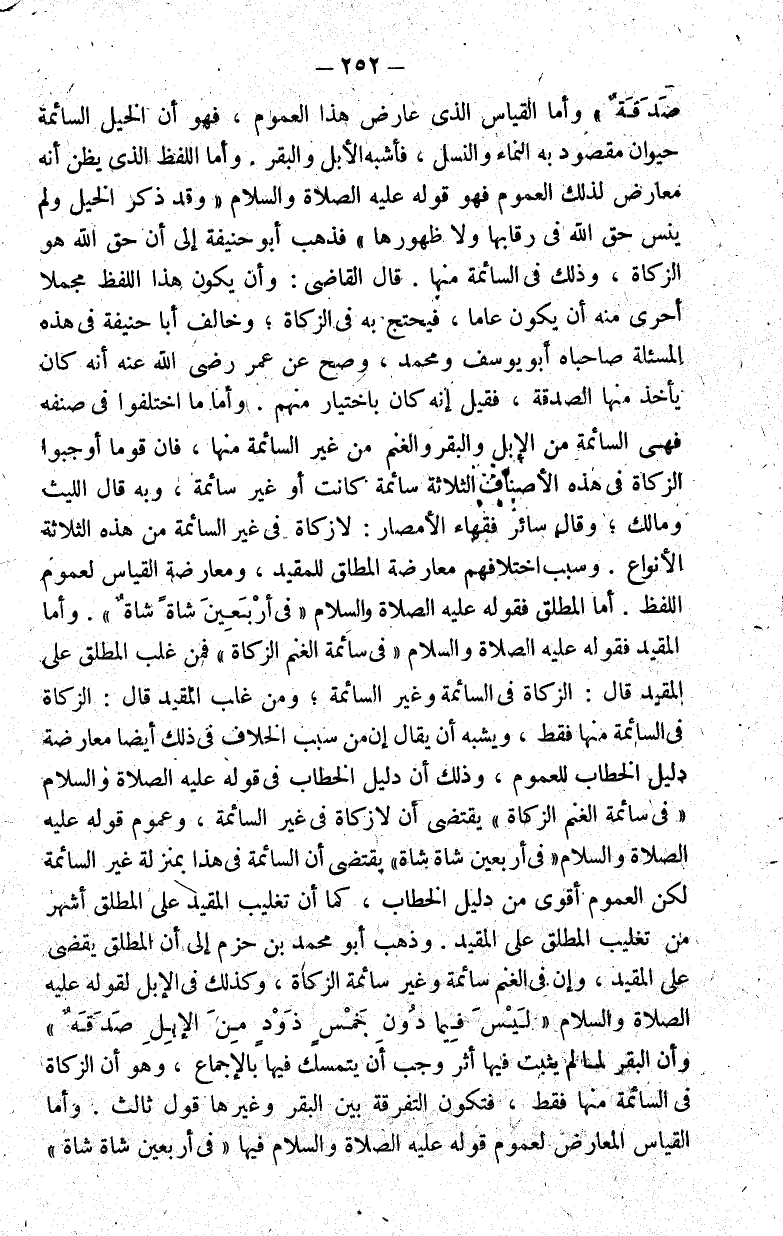 صدقة" وأما القياس الذي عارض هذا العموم فهو أن الخيل السائمة حيوان مقصود به النماء والنسل. فأشبه الإبل والبقر. وأما اللفظ الذي يظن أنه معارض لذلك العموم فهو قوله عليه الصلاة والسلام: "وقد ذكر الخيل ولم ينس حق الله في رقابها ولا ظهورها" فذهب أبو حنيفة إلى أن حق الله هو الزكاة وذلك في السائمة منها. قال القاضي: وأن يكون هذا اللفظ مجملا أحرى منه أن يكون عاما فيحتج به في الزكاة عدا أبا حنيفة في هذه المسألة صاحباه أبو يوسف ومحمد وصح عن عمر رضي الله عنه أنه كان يأخذ منها الصدقة فقيل إنه كان اختيار منهم. وأما ما اختلفوا في صنفه فهي السائمة من الإبل والبقر والغنم من غير السائمة منها فإن قوما أوجبوا الزكاة في هذه الأصناف الثلاثة سائمة كانت أو غير سائمة وبه قال الليث ومالك وقال سائر فقهاء الأمصار: لا زكاة في غير السائمة من هذه الأنواع الثلاثة. وسبب اختلافهم معارضة المطلق للمقيد ومعارضة القياس لعموم اللفظ. أما المطلق فقوله عليه الصلاة والسلام: "في أربعين شاة شاة" . وأما المقيد فقوله عليه الصلاة والسلام: "في سائمة الغنم الزكاة" فمن غلب المطلق على المقيد قال: الزكاة في السائمة وغير السائمة ومن غلب المقيد قال: الزكاة في السائمة منها فقط ويشبه أن يقال إن من سبب الخلاف في ذلك أيضا معارضة دليل الخطاب للعموم. وذلك أن دليل الخطاب في قوله عليه الصلاة والسلام: "في سائمة الغنم الزكاة" يقتضي أن لا زكاة في غير السائمة وعموم قوله عليه الصلاة والسلام: "في كل أربعين شاة شاة" يقتضي أن السائمة في هذا بمنزلة غير السائمة لكن العموم أقوى من دليل الخطاب كما أن تغليب المقيد على المطلق أشهر من تغليب المطلق على المقيد. وذهب أبو محمد بن حزم إلى أن المطلق يقضي على المقيد وأن في الغنم سائمة وغير سائمة الزكاة وكذلك في الإبل لقوله عليه الصلاة والسلام: "ليس فيما دون خمس ذود من الإبل صدقة" وأن البقر لما لم يثبت فيها أثر وجب أن يتمسك فيها بالإجماع وهو أن الزكاة في السائمة منها فقط فتكون التفرقة بين البقر وغيرها قولا ثالثا. وأما القياس المعارض لعموم قوله عليه الصلاة والسلام فيها: "في أربعين شاة شاة"