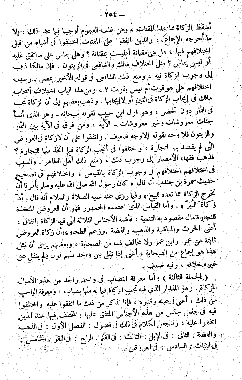 وأما معرفة النصاب في واحد واحد من هذه الأموال المزكاة وهو المقدار الذي فيه تجب الزكاة فيما له منها نصاب ومعرفة الواجب من ذلك أعني في عينه وقدره فإنا نذكر من ذلك ما اتفقوا عليه واختلفوا فيه في جنس جنس من هذه الأجناس المتفق عليها والمختلف فيها عند الذين اتفقوا عليه ولنجعل هذا الكلام في ذلك في فصول: الفصل الأول: في الذهب والفضة.؟ الثاني: في الإبل. الثالث: في الغنم. الرابع: في البقر. الخامس: في النبات. السادس: في العروض.